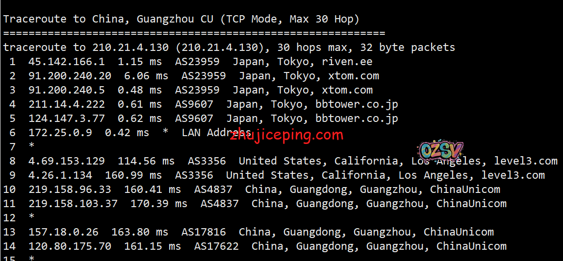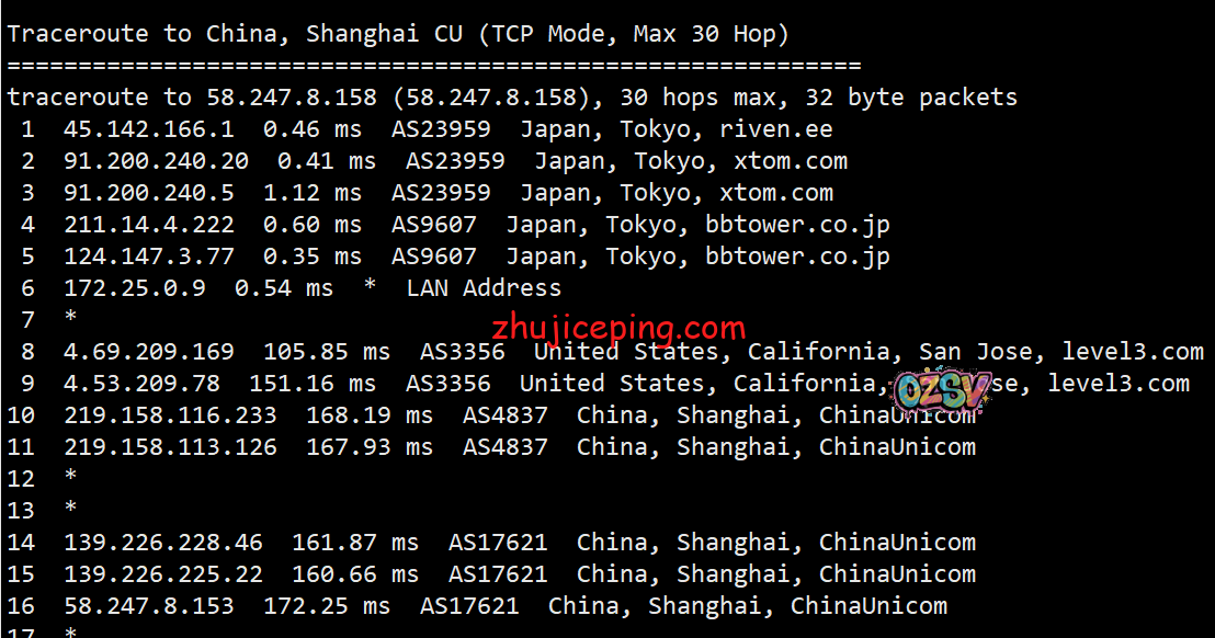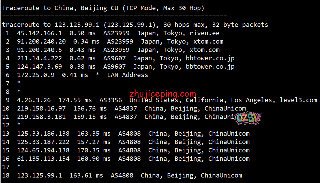 回程,联通从日本出来后走level3到美国后AS4837回国,相当于买了美国VPS走AS4837回来。