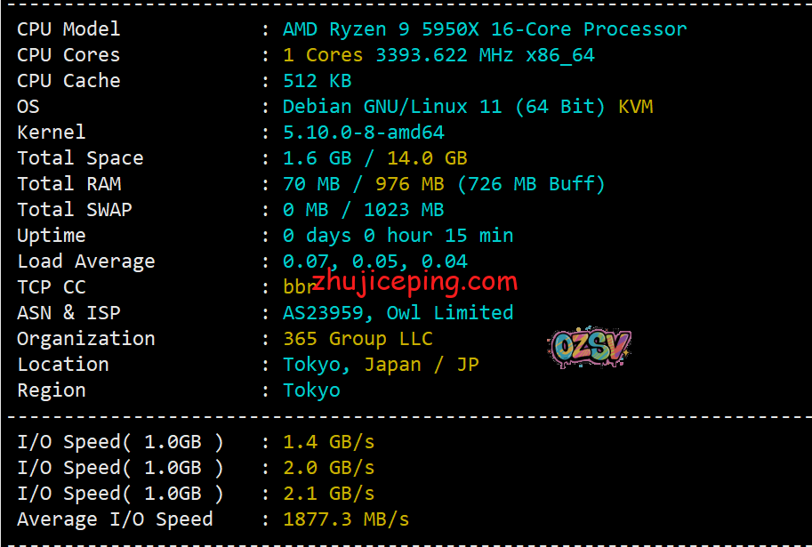 拿到VPS之后顺手开启BBR,看到CPU是AMD Ryzen 9 5950X,3.4GHz主频,这货睿频4.9GHz,硬盘I/O大致在1.8GB/S左右: