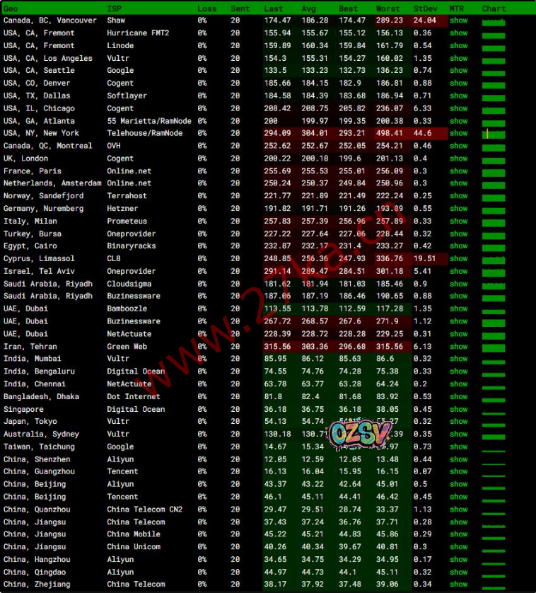 下面是通过第三方工具测评的全球各地网络稳定性情况,如下所示: