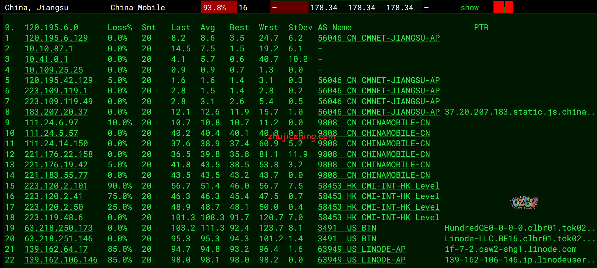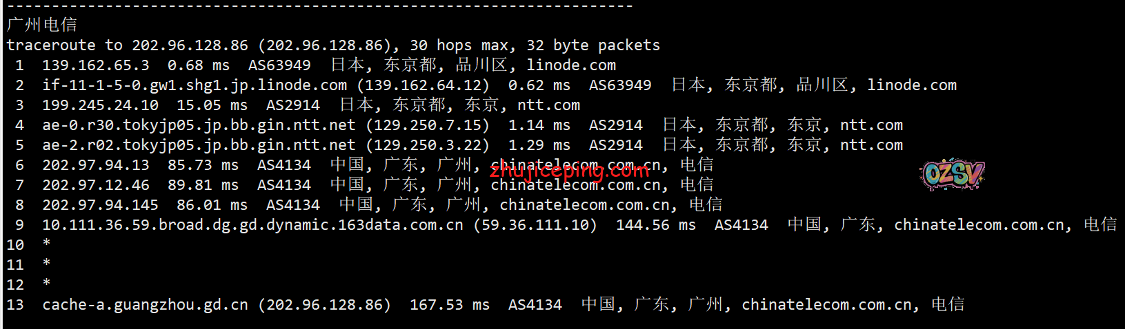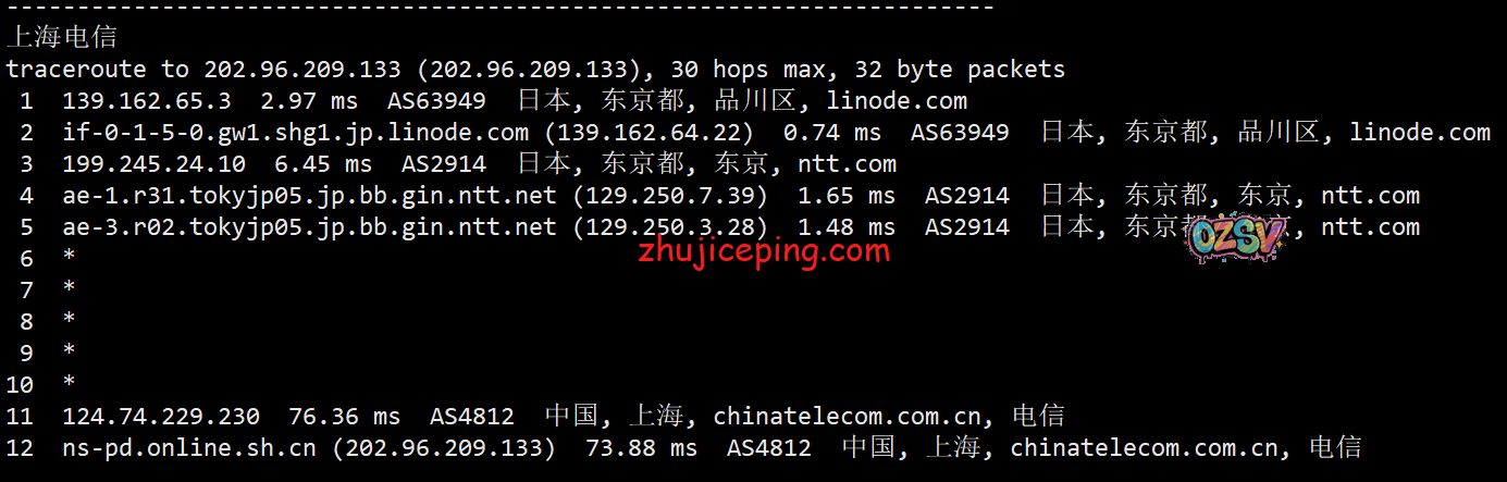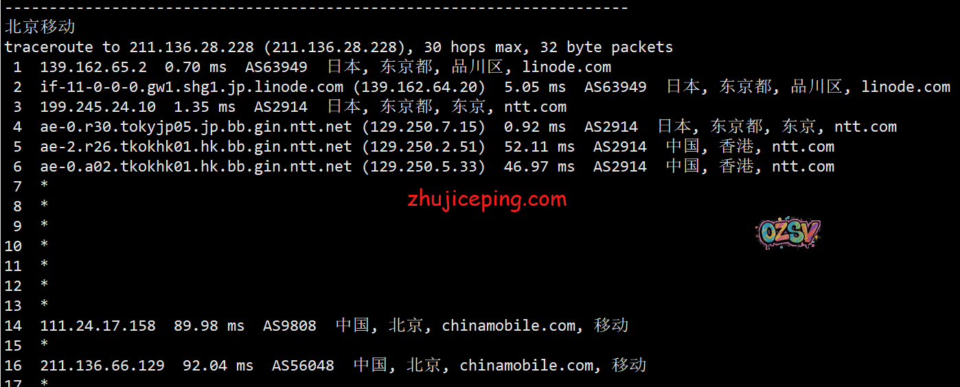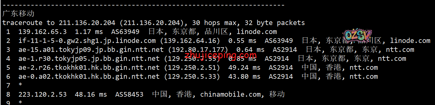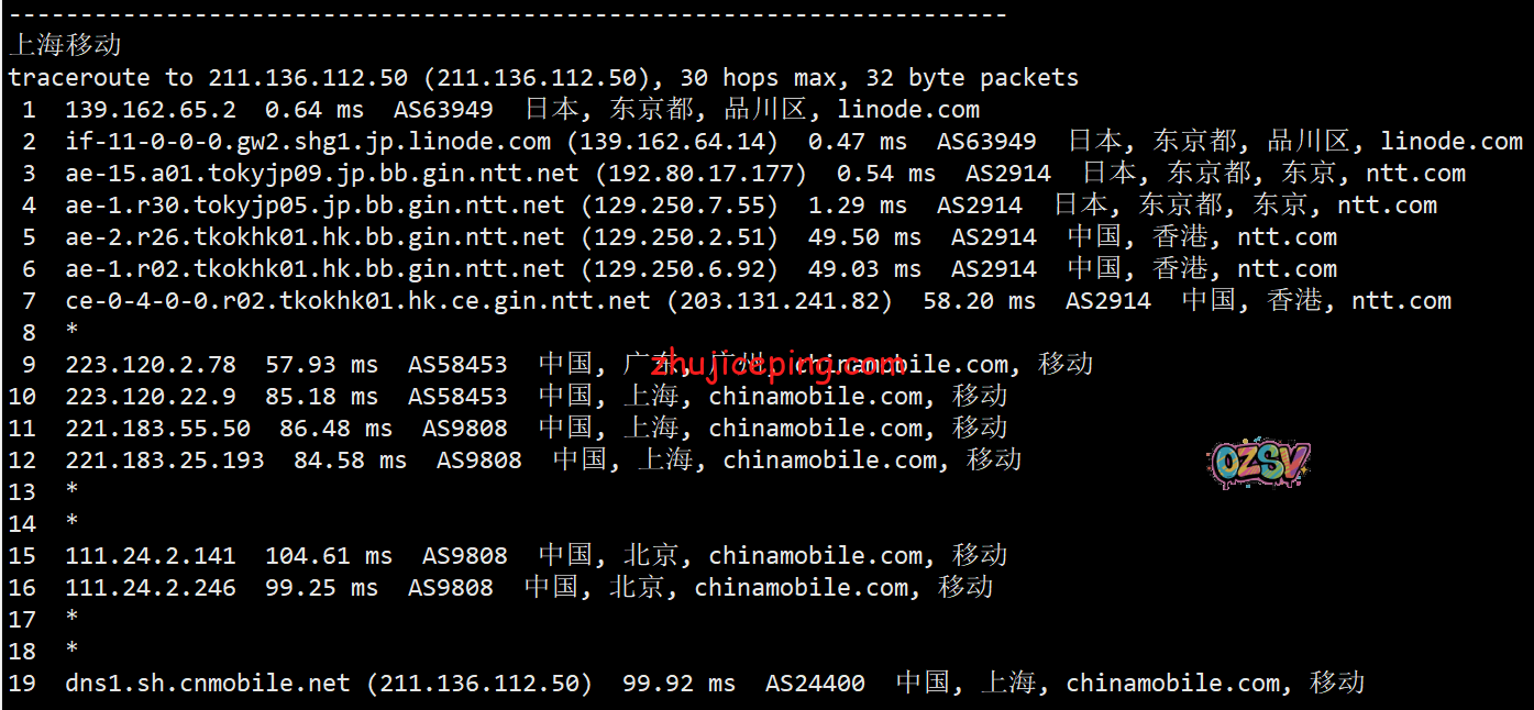 回程,到国内移动:日本NTT到香港NTT后直连回来
