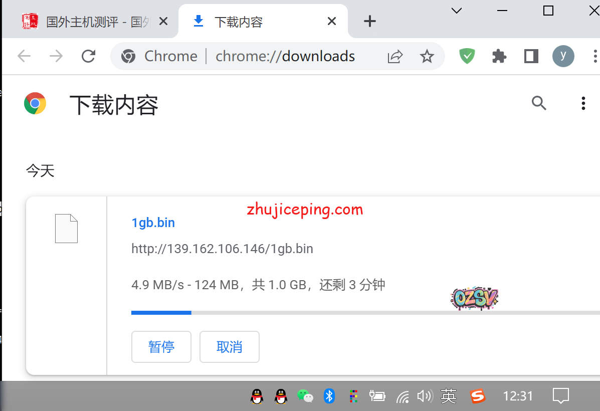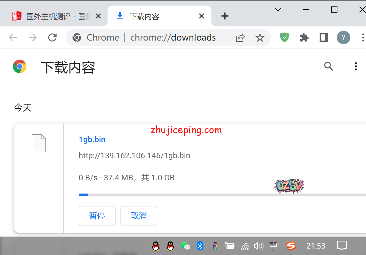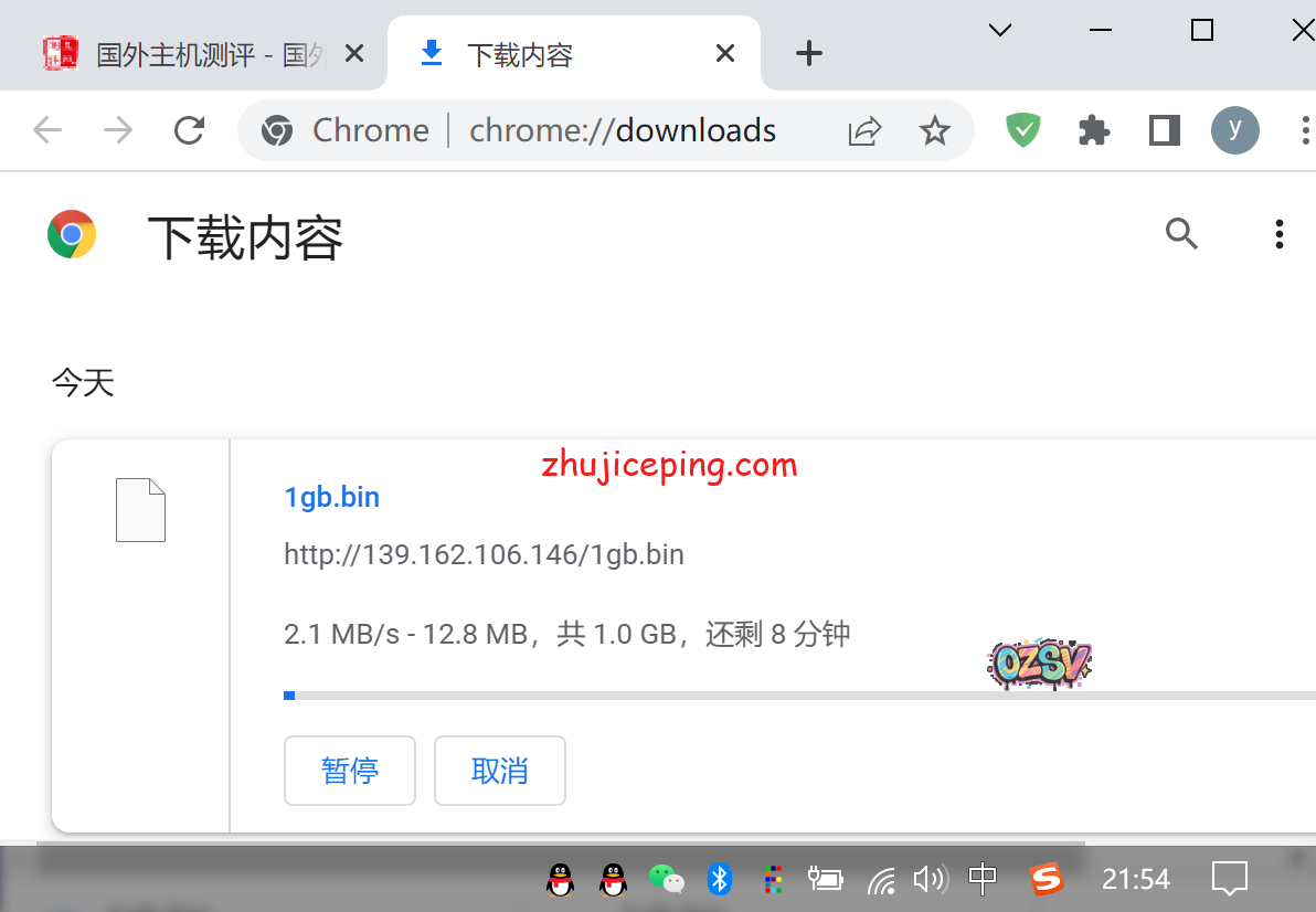 存放在VPS上的文件,站长是广州电信,通过直接用Chrome浏览下载做最直观的测速,站长用三张图告诉你最真实的情况:中午时段速度有4.9MB/S,晚高峰期间出现断流速度为0卡顿后然后恢复到2.1MB/S,差不多就这样的情况会反复出现。