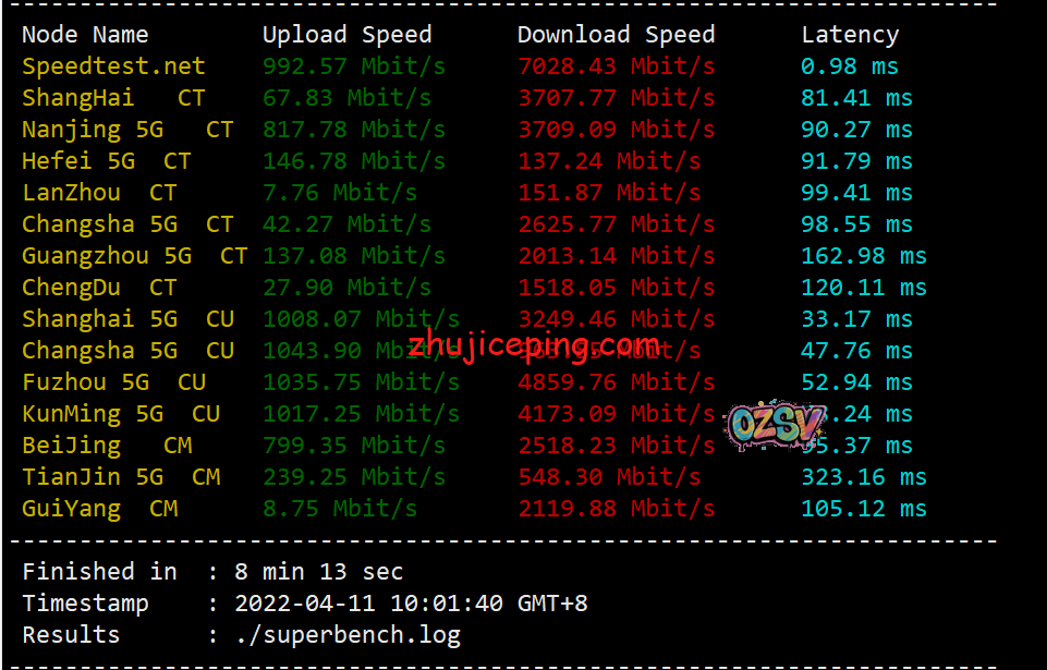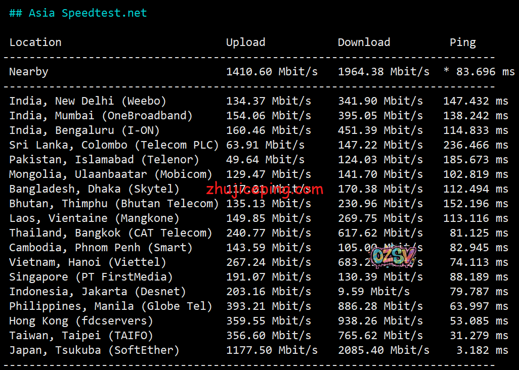 亚洲区域内其他节点的上下行测试,数据如下: