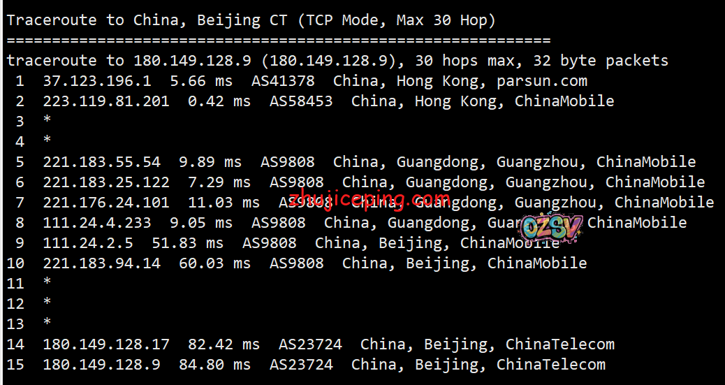 回程,到大陆电信:全部走AS9808移动CMI回来后转电信