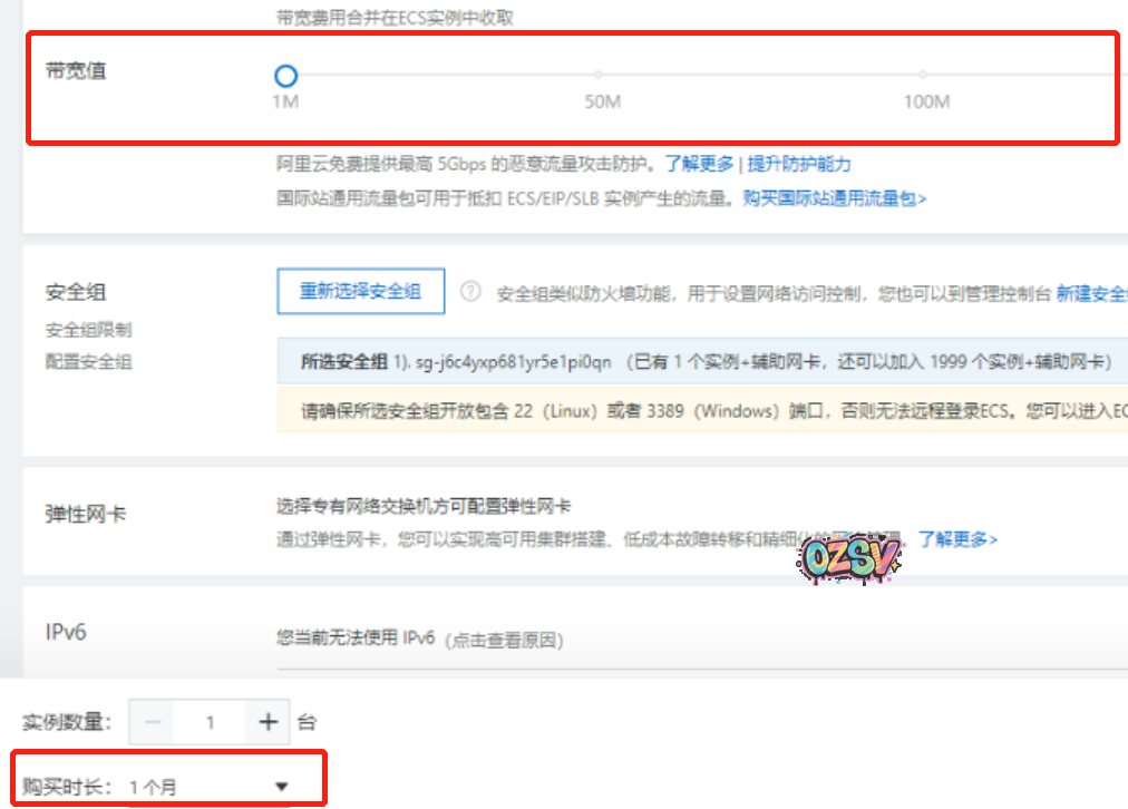 系统默认的都是1M的带宽,可根据选择更改;最下面有购买时长的选择。