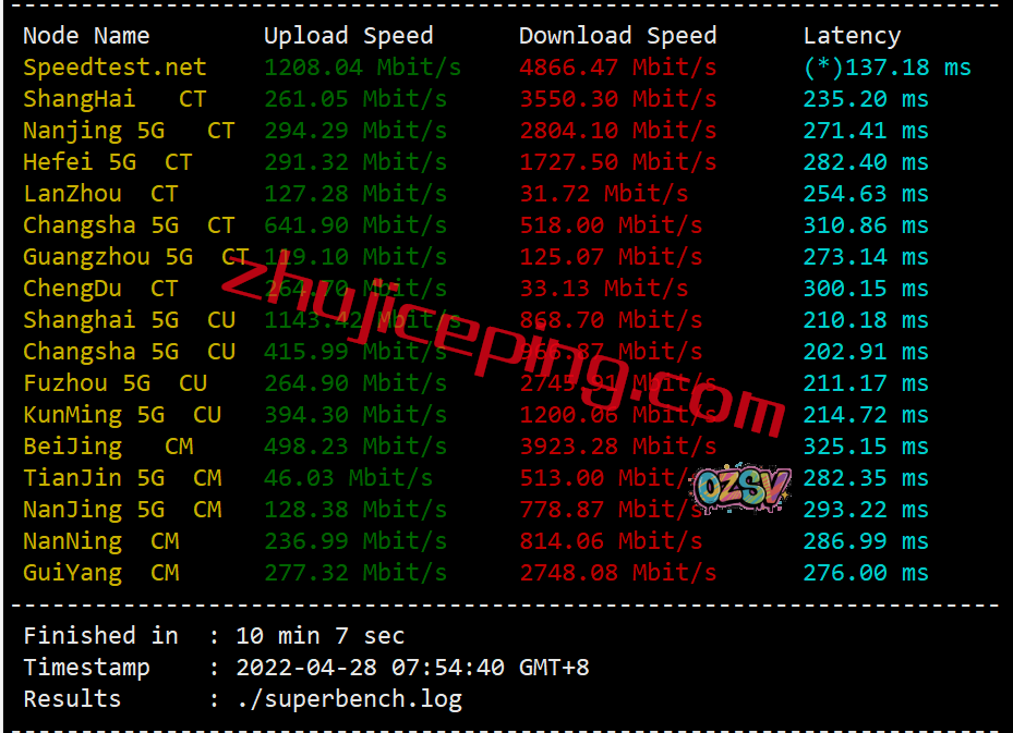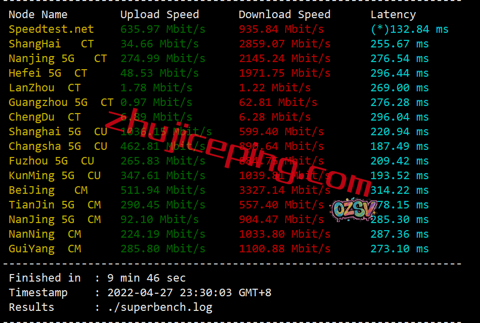 用speedtest.net的节点来跑一下吧,看看上行和下行能跑多少: