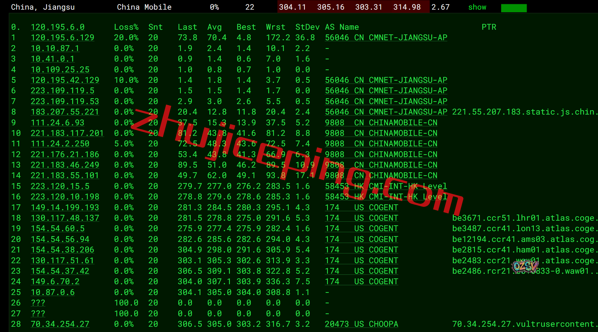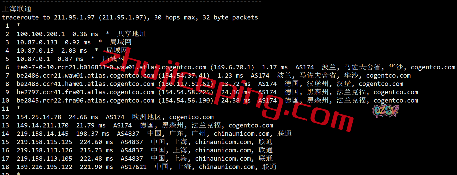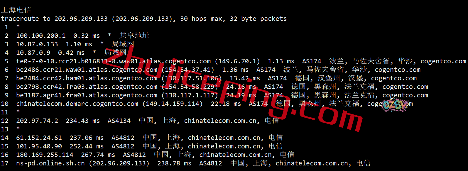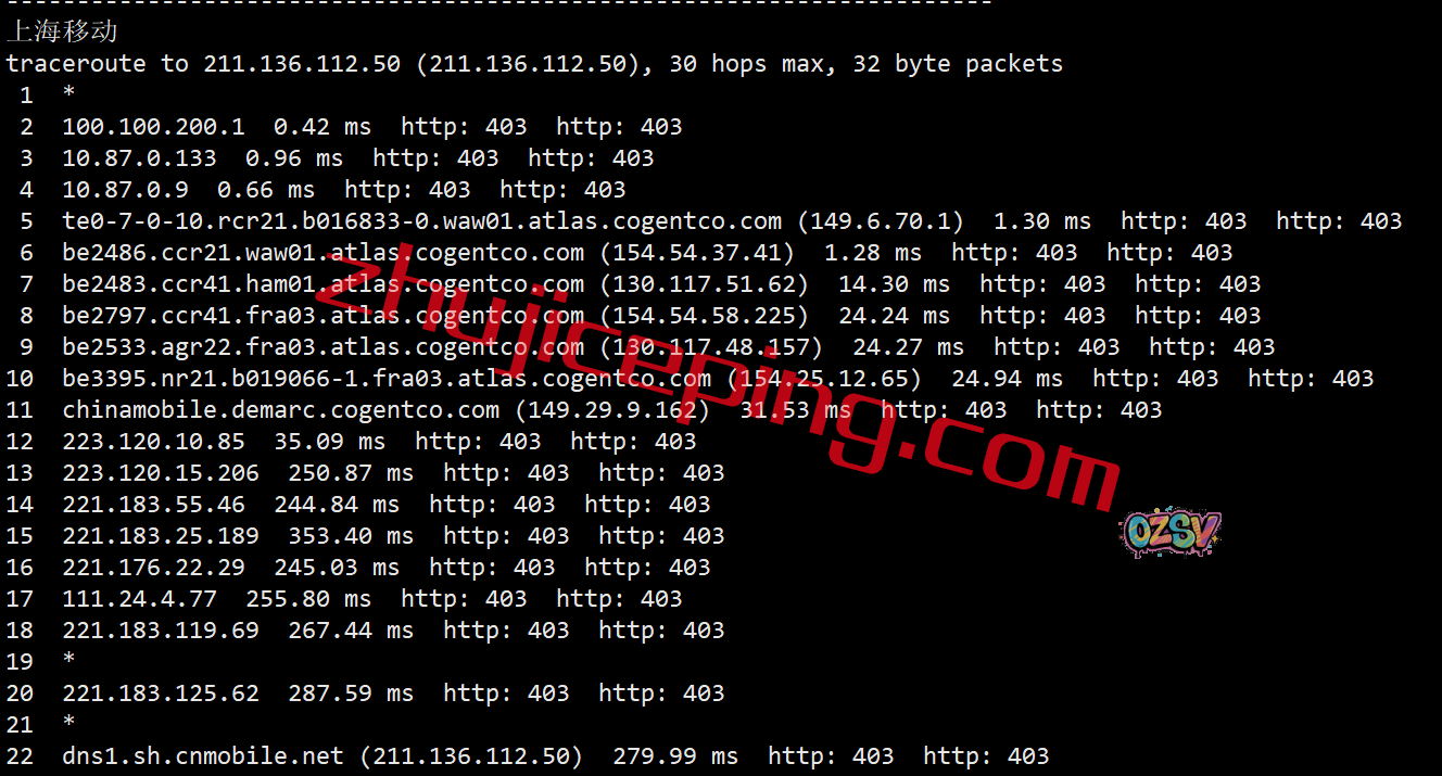 上海方向:走cogent到德国法兰克福,然后从移动在德国的节点直接回来