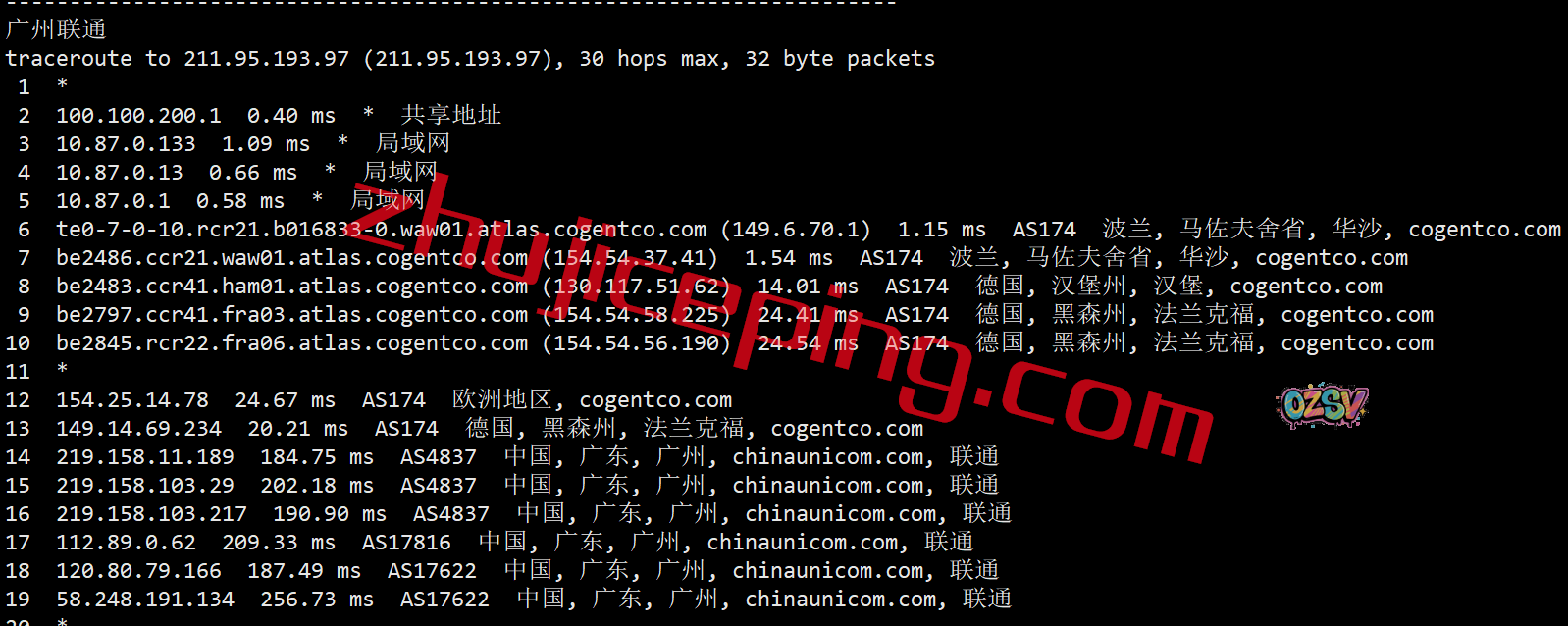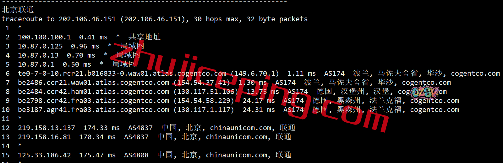 回程,到国内联通:走cogent到德国法兰克福直接连接国内AS4837