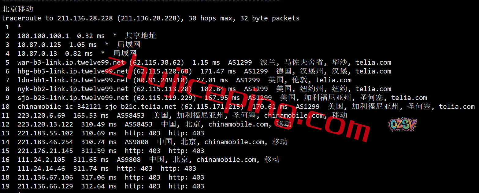 北京方向:走telia到伦敦然后到纽约再圣何塞,走移动圣何塞节点直接回国