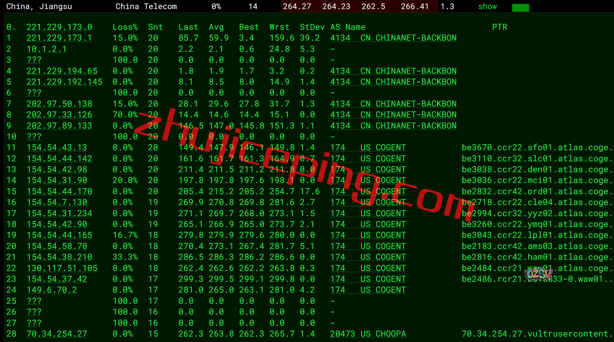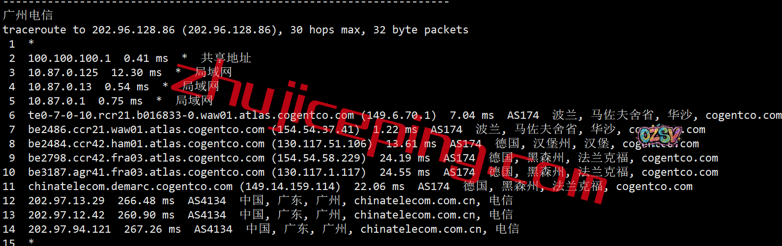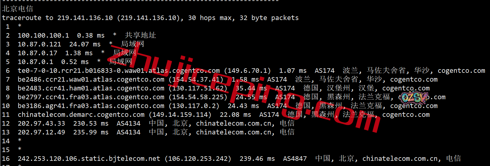 回程,到国内电信:走cogent到德国法兰克福,通过电信的节点回来