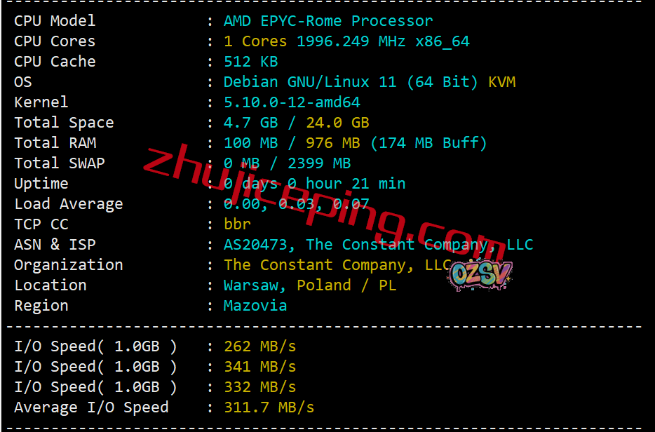 CPU给大家说下,是AMD EPYC™ 7702 、7702P、7662这三款里面的一个,官方有提示说明的。站长开启了BBR,可以看到的是Vultr自己的广播IP,当前硬盘I/O大致在311MB/s: