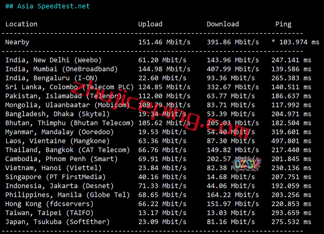 亚洲区域内的多个节点的测试情况: