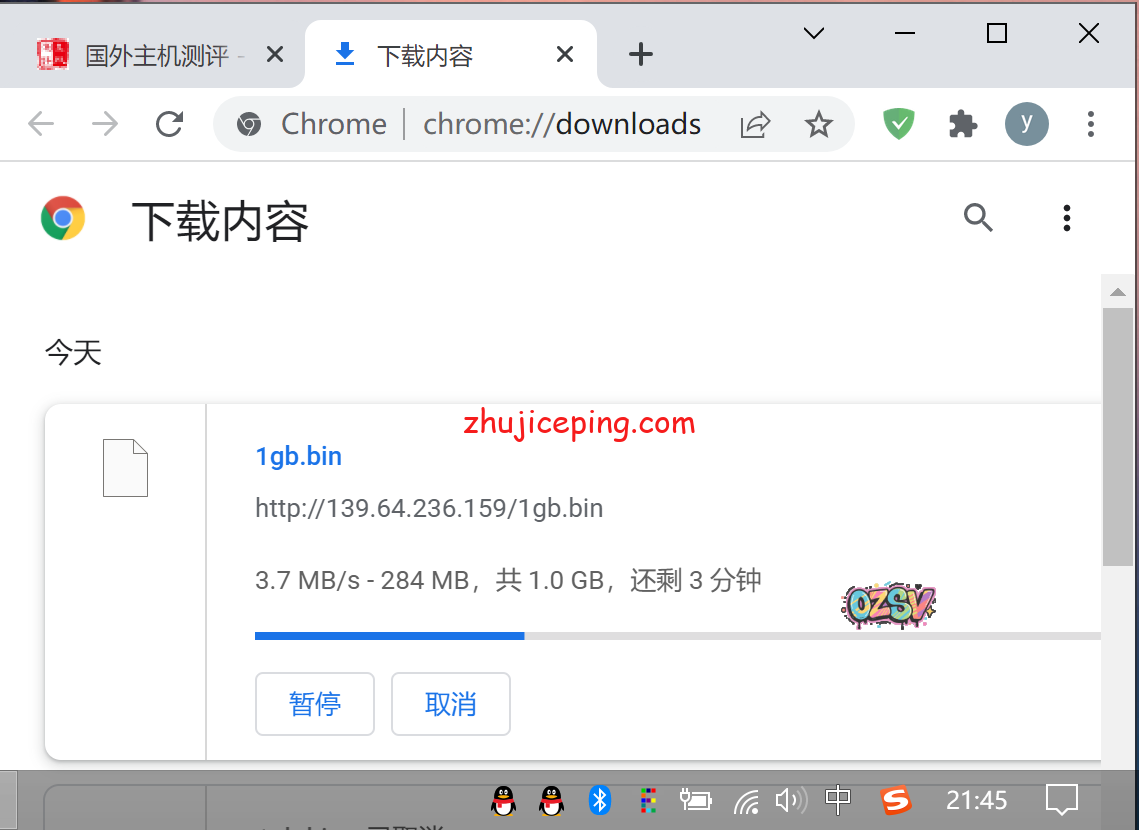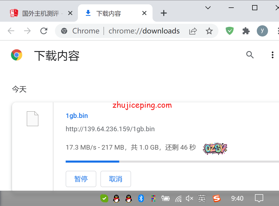 存放在测试VPS上面的数据文件,站长是广州电信,直接用浏览器Chrome来下载测速,白天大致可以跑到17.3MB/S: