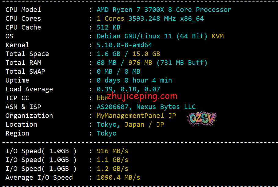 拿到了日本的VPS,CPU是ryzen 7 3700X,顺手开启BBR,硬盘I/O大致在1090MB/S: