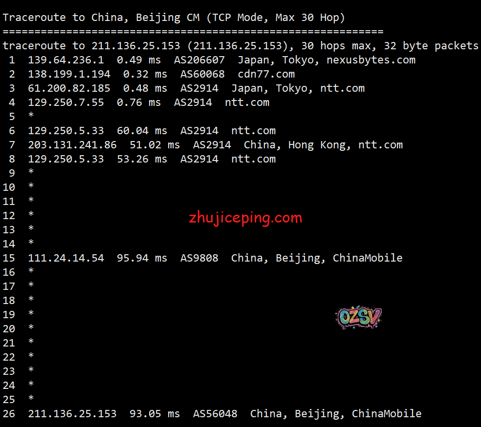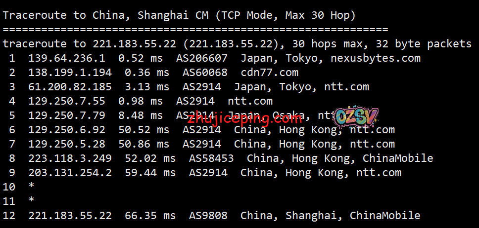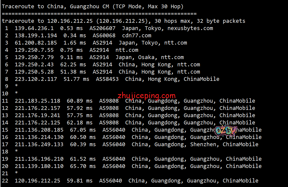 回程,到国内移动:北京和上海方向,日本NTT到香港NTT然后回大陆;广州方向是日本NTT到香港后转移动香港节点回来