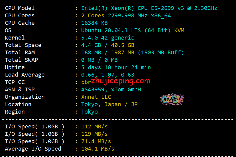 CPU是e5-2699v3,2.3GHz的主频,硬盘I/O大致在104MB/S左右,看起来像是xTom的网络: