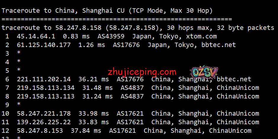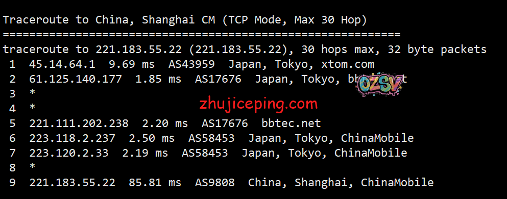 上海方向,机房出来走软银到中国移动在东京的节点,然后直接回来;