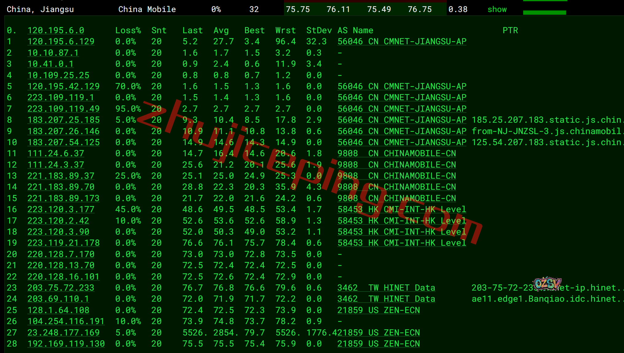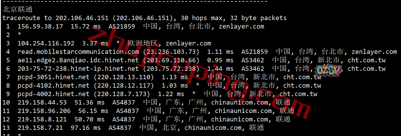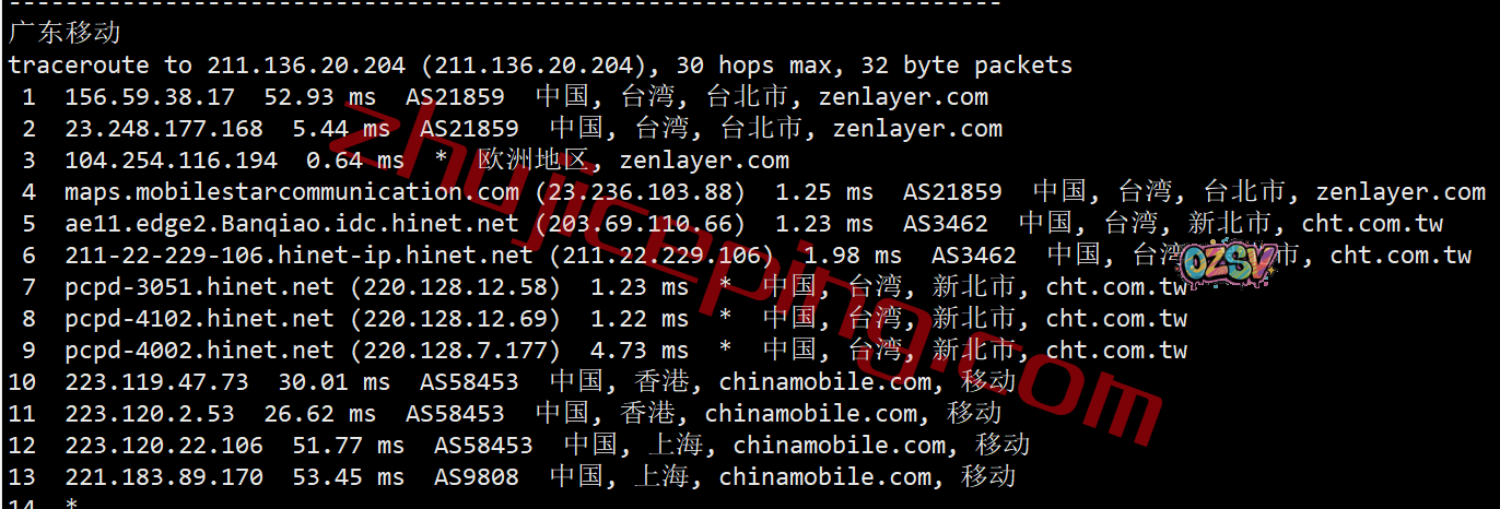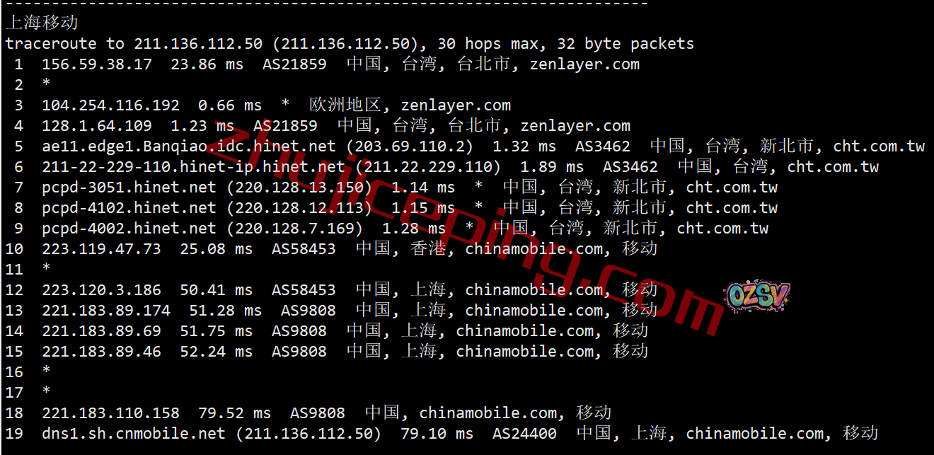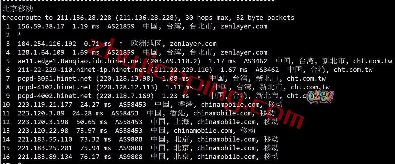回程,到大陆移动:hinet直连香港移动然后回来,基本相当于直连