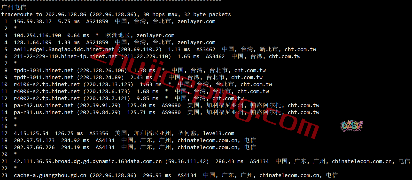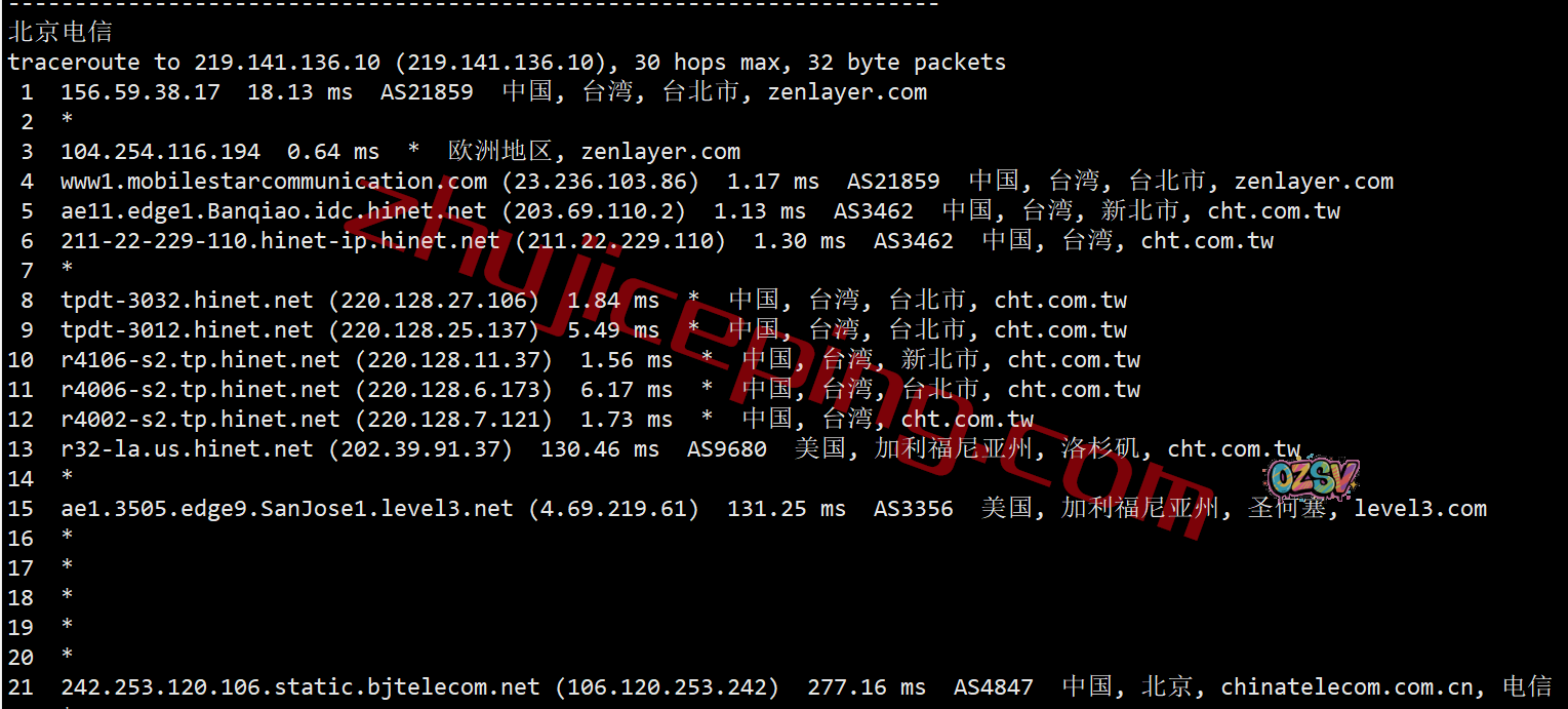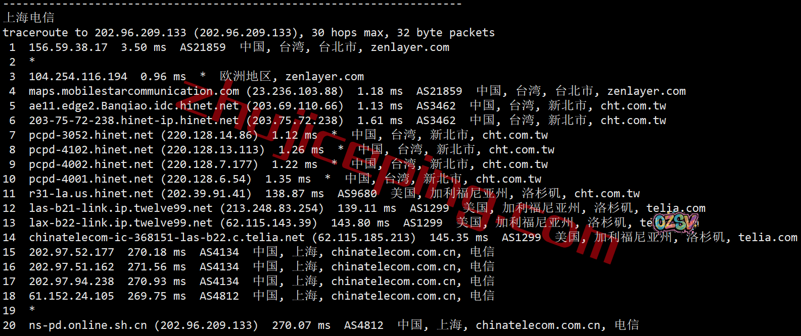 回程,到大陆移动:hinet直连香港移动然后回来,基本相当于直连