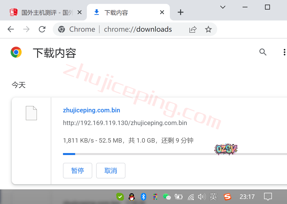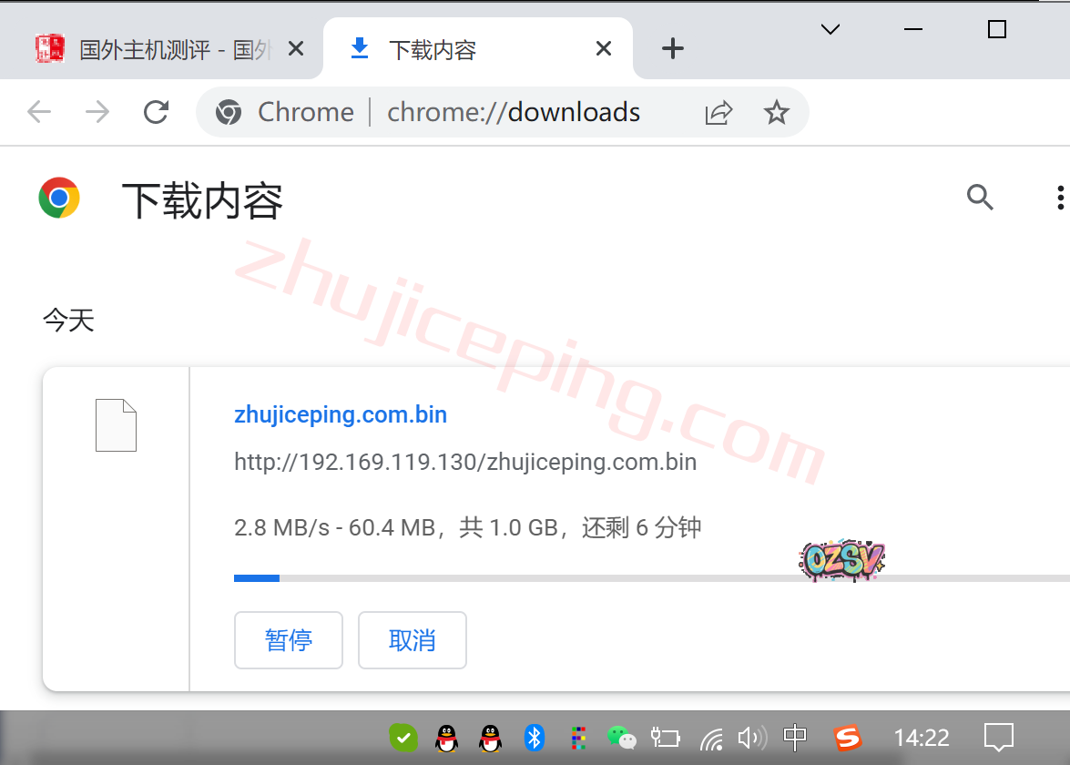 广州电信,直接用浏览器下载存放在测试小鸡上的文件,大致速度: