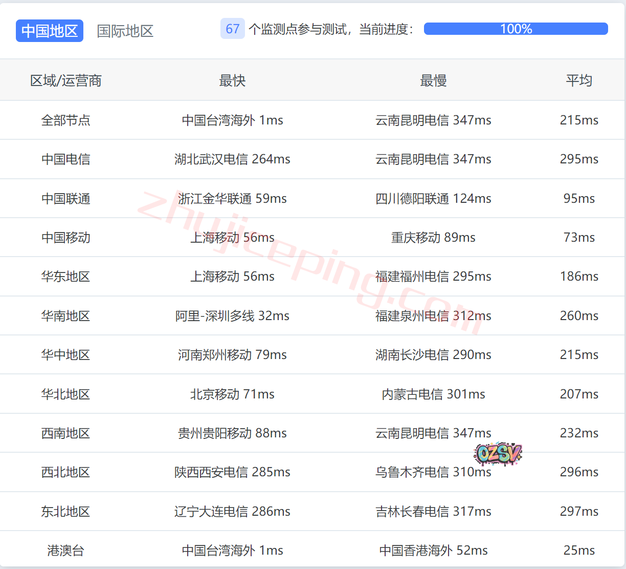 再看看美国、欧洲、亚洲、非洲的部分节点的测试数据: