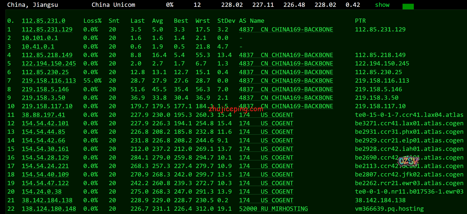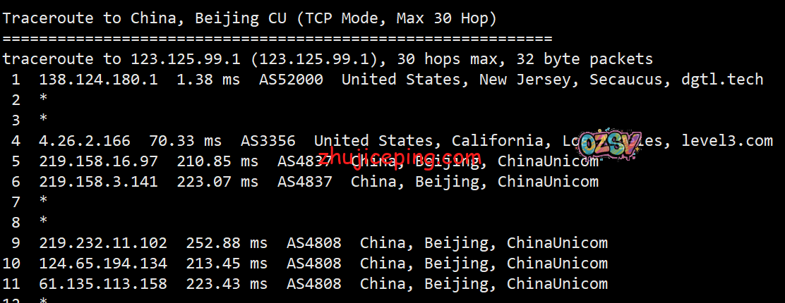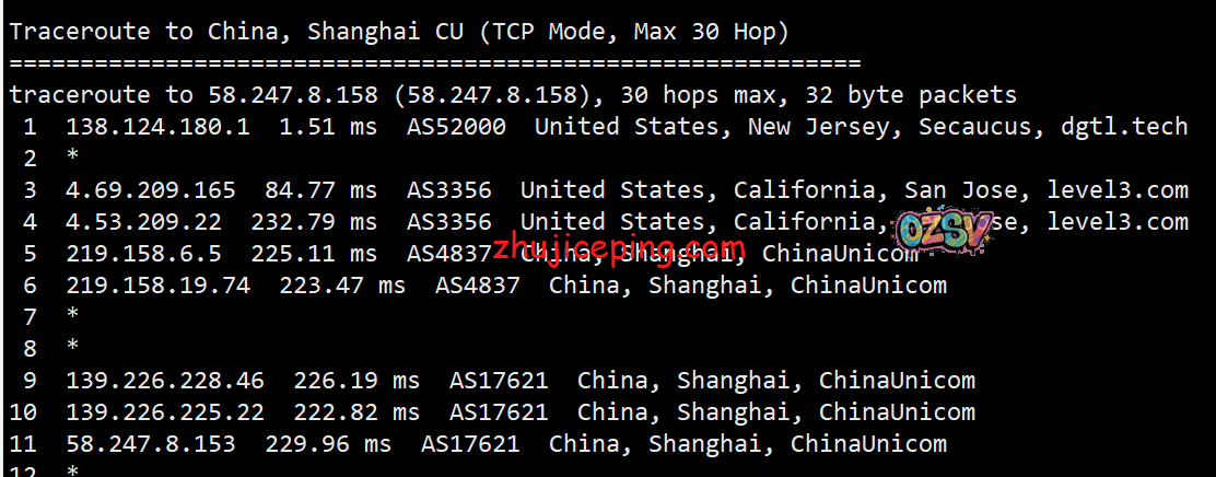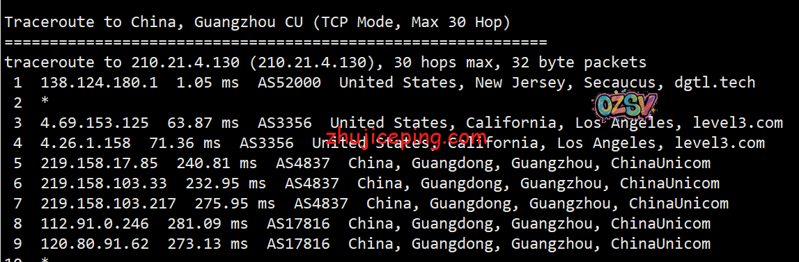 回程,到国内联通:洛杉矶或者圣何塞level3线路回来