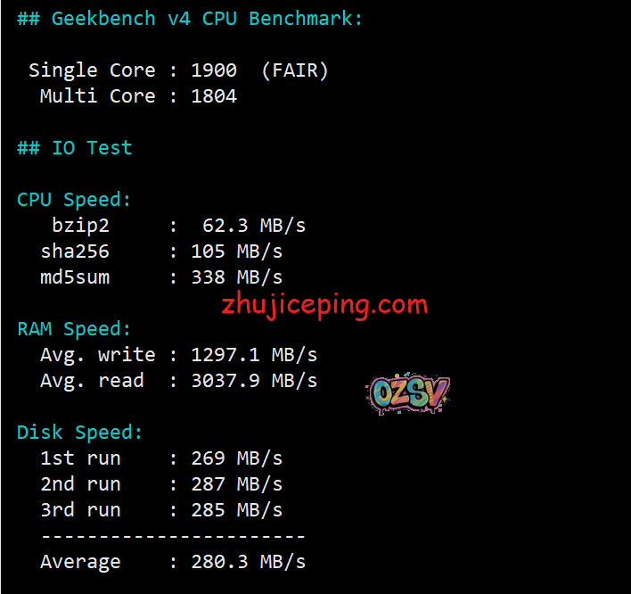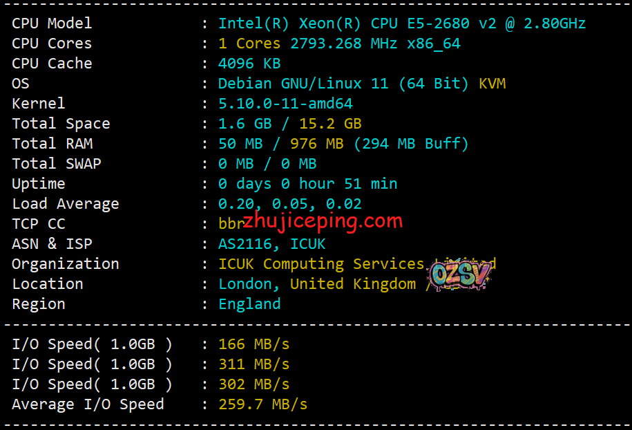 通过目前为止测试过的几个机房的vps来看,貌似CPU全部都是e5-2680v2,看来官方说自己的机器设备都是自己托管的,貌似全部都是一样的型号。当前硬盘I/O大致259MB/S: