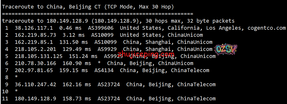回程,到国内电信:标准AS9929回国路由,先国际AS10099然后接AS9929,到国内转电信骨干网