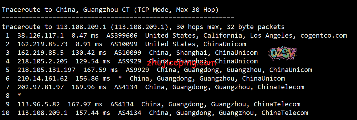 电信去程,电信骨干网转联通AS9929后接联通国际AS10099到美国机房: