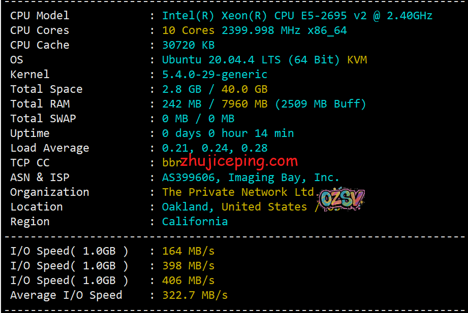 拿到VPS看到cpu是e5-2695v2(2.4GHz主频),站长默认开启BBR,硬盘I/O大致322MB/S,IP归属为美国: