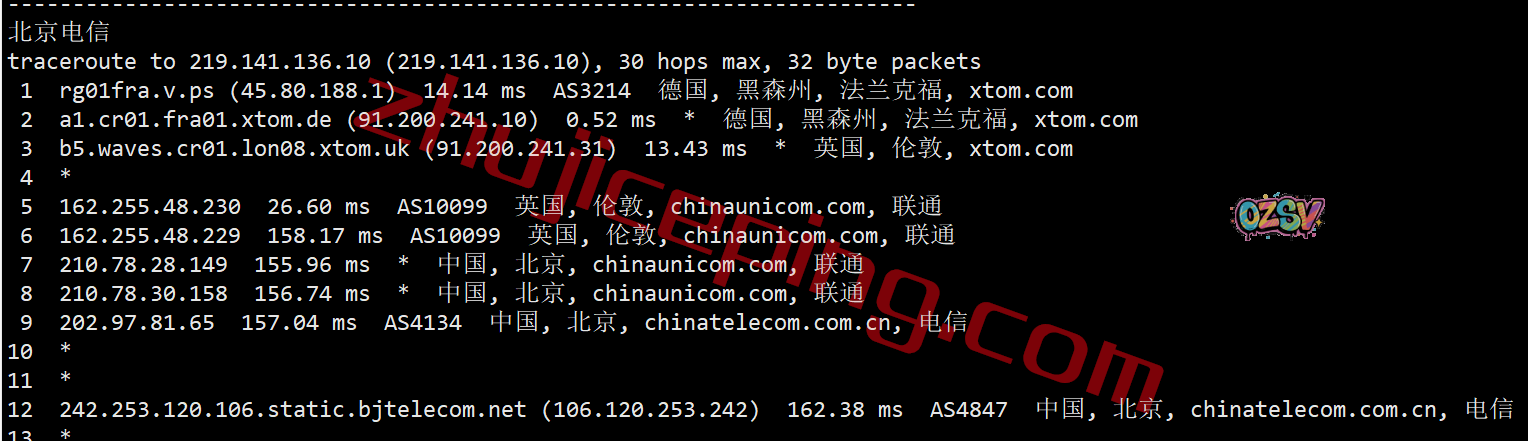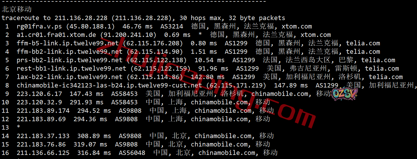 北京方向:走telia经过法国、美国东海岸-西海岸、经过移动洛杉矶节点直接回国