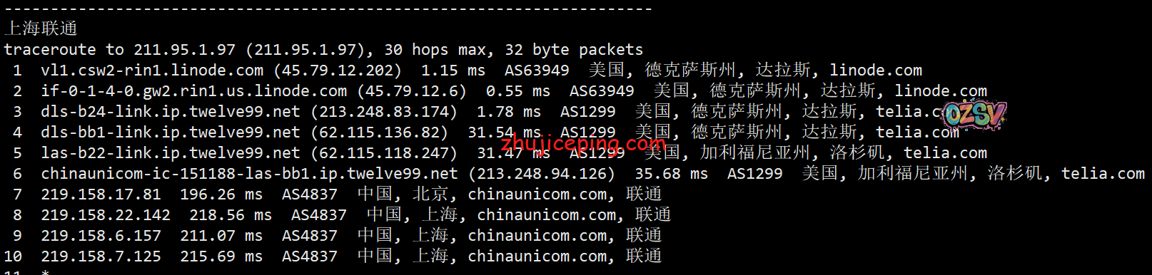 上海方向:走telia到洛杉矶出口对接联通AS4837