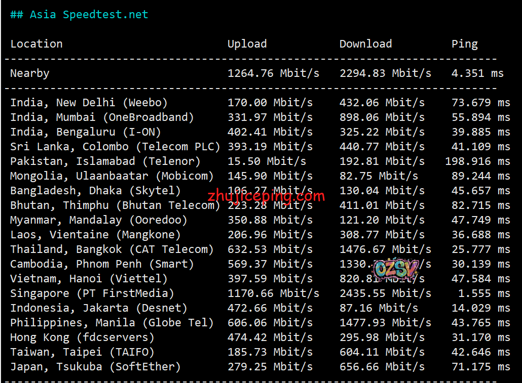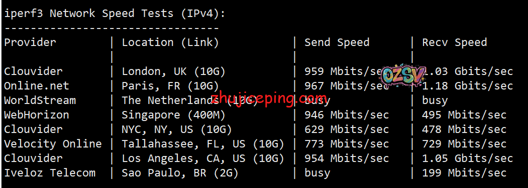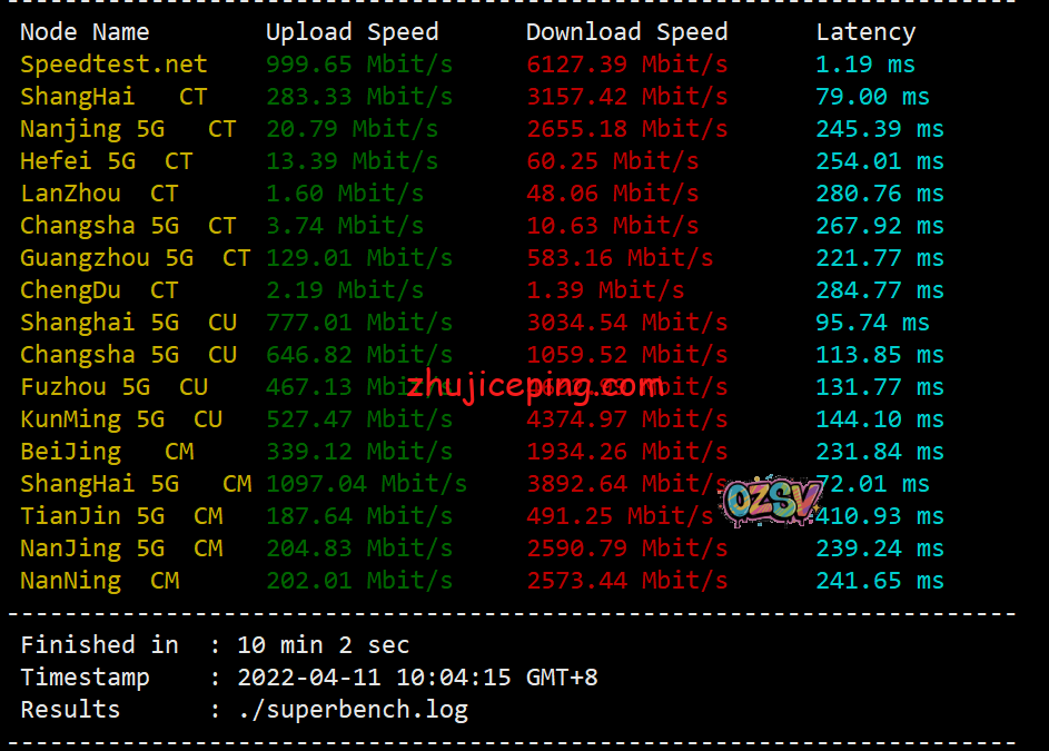 我们来试试看VPS的网络能跑到什么样子? speedtest的就近节点显示上行1Gbps、下行6Gbps,然后看看国内三网的情况:电信惨不忍睹,这还是白天;联通整体来说还算不错,移动也比电信好不少。