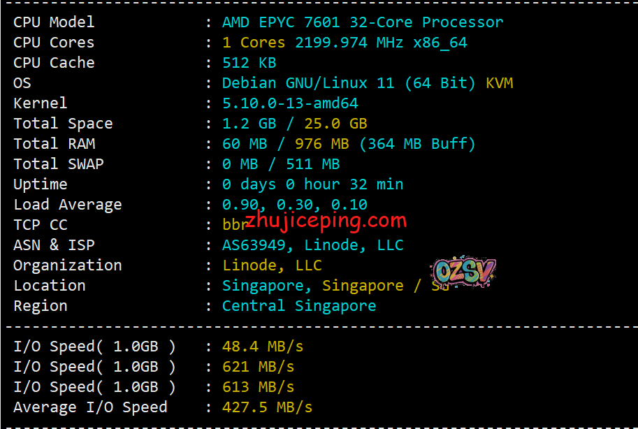 开了个最低配的新加坡云服务器,CPU是amd epyc 7601,2.2GHz主频,当前大致I/O在427MB/S的样子,开启了BBR: