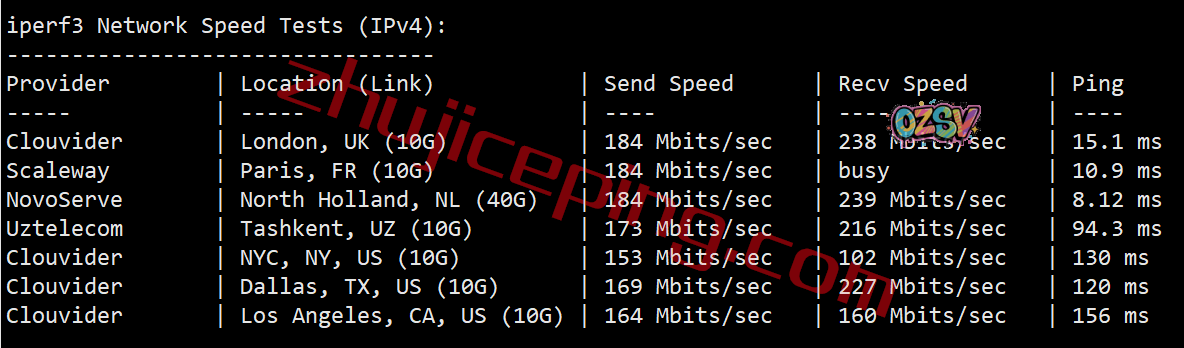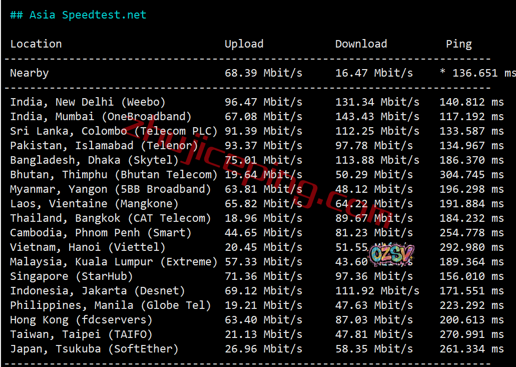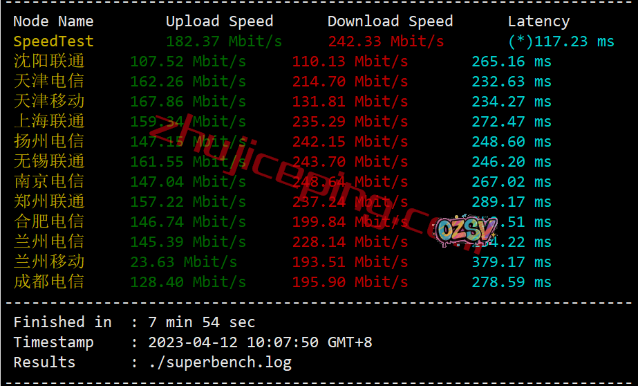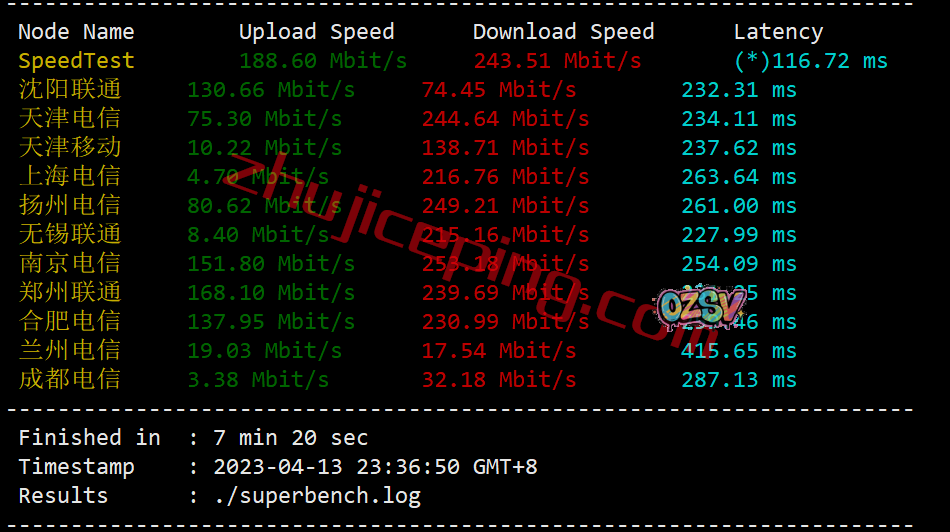 站长选的是4G内存的VPS,想跑一下国内节点测试下上下行带宽能冲到多少,这里用的speedtest在国内的三网节点,大致数据如下: