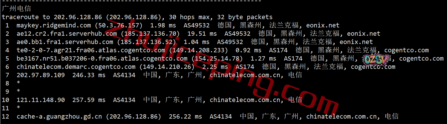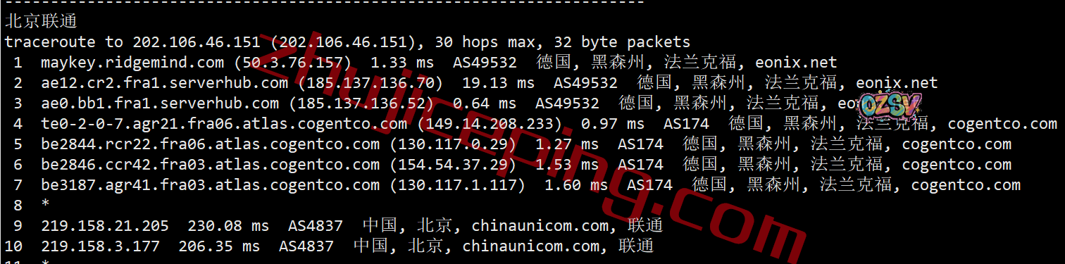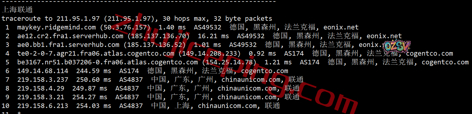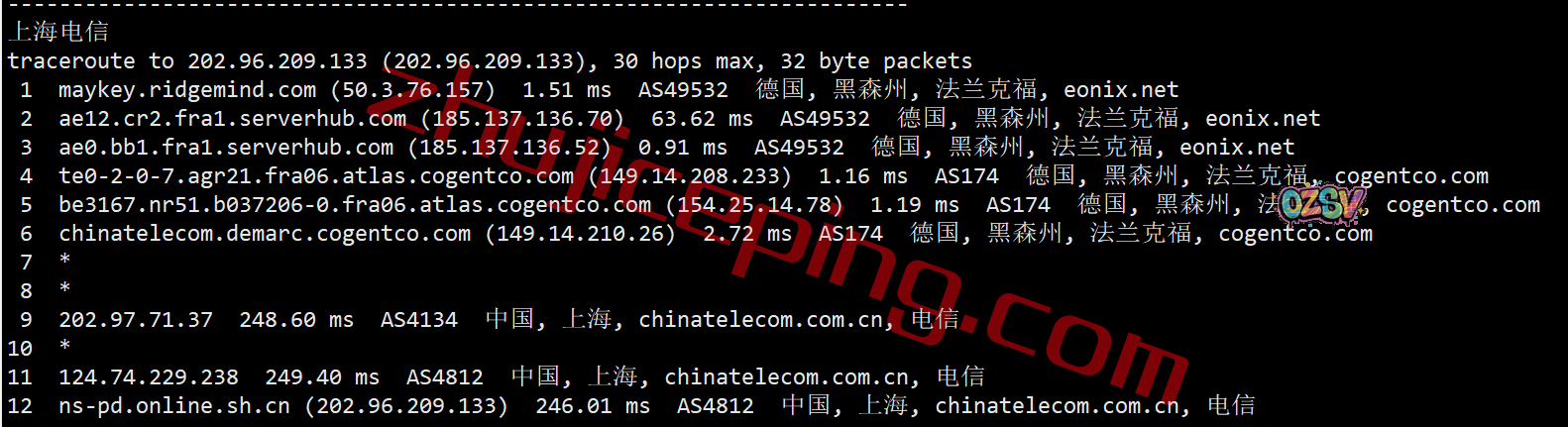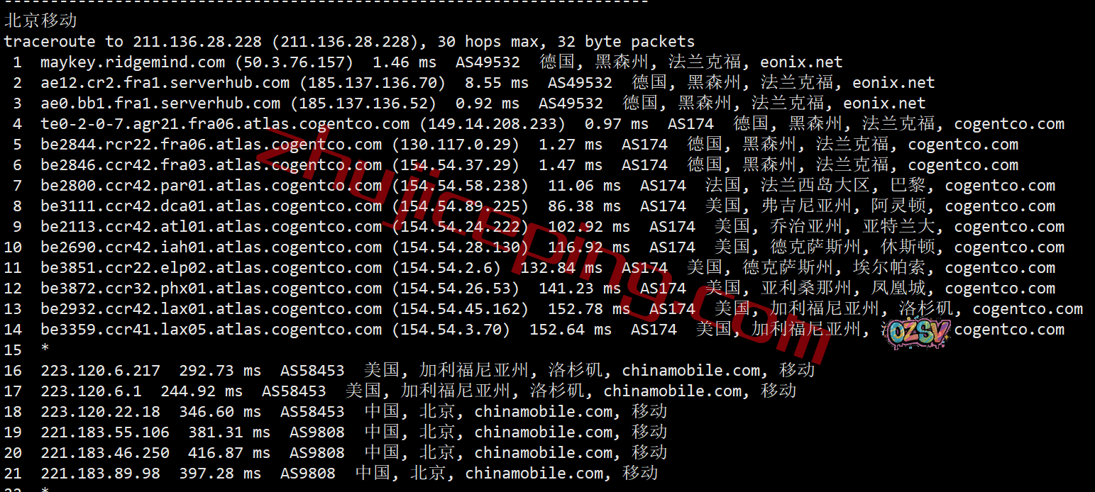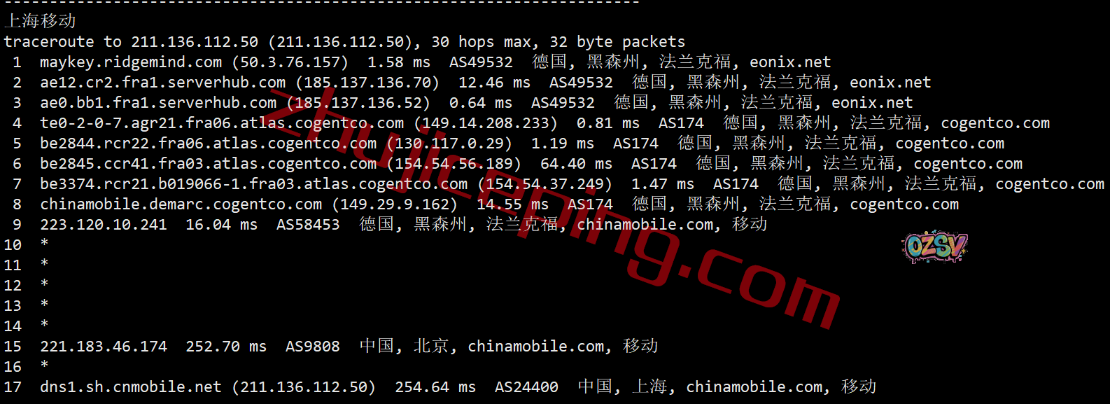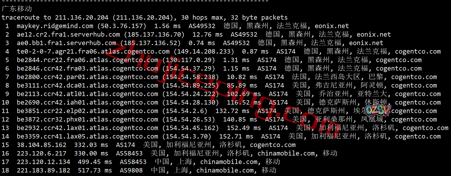 上海方向:走cogent到法兰克福,从移动法兰克福节点直连回国