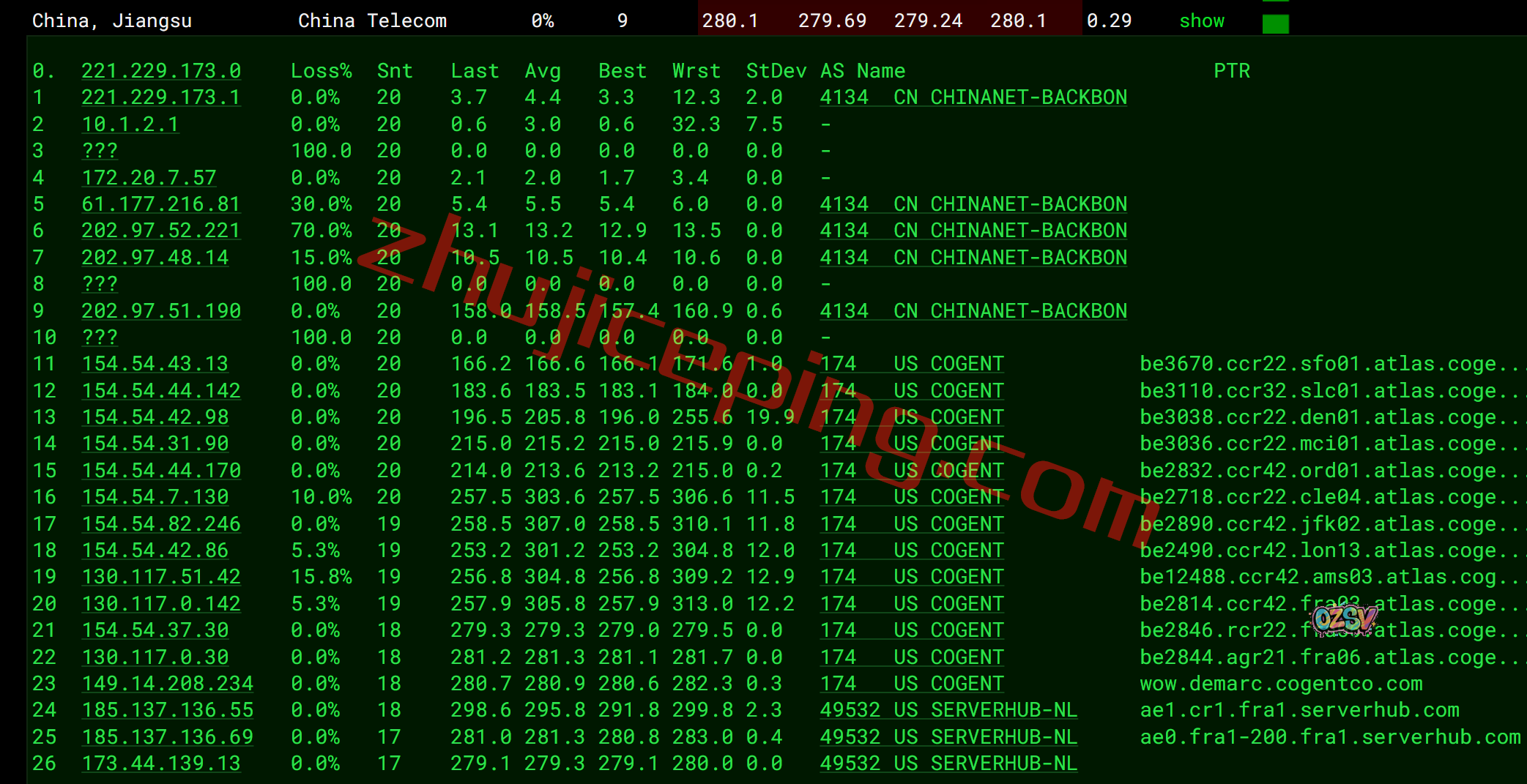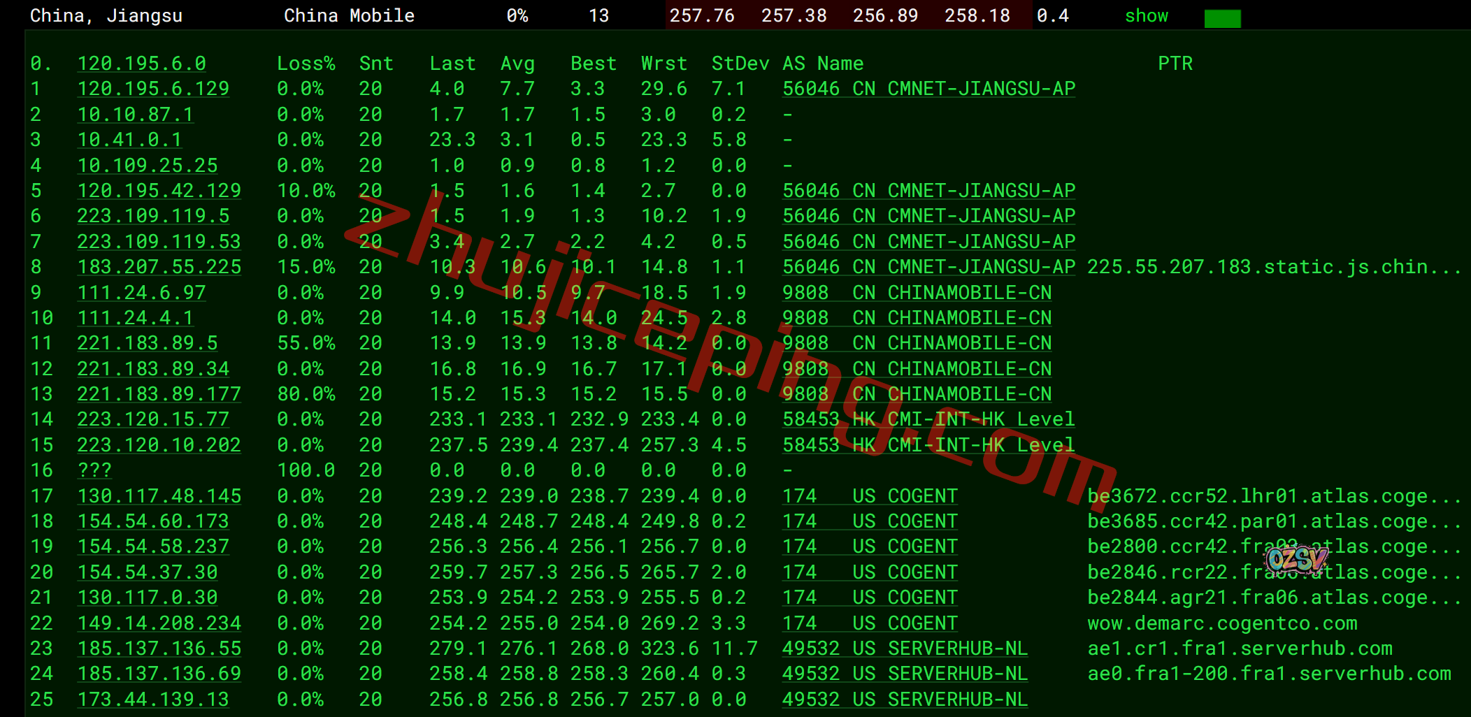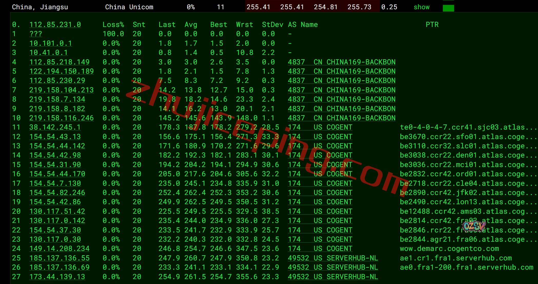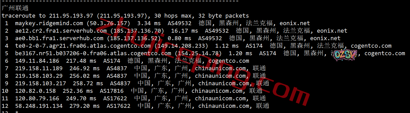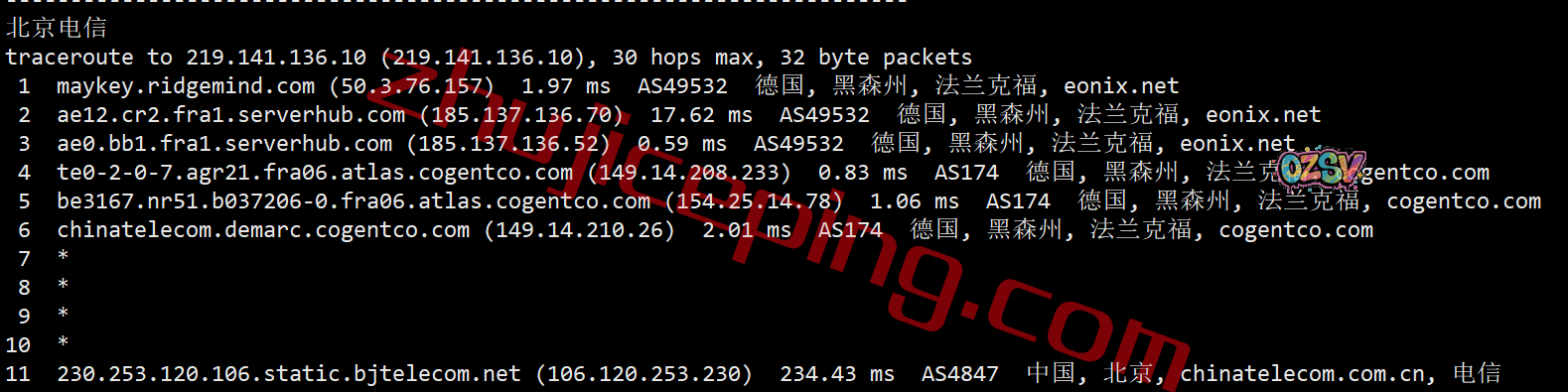 上海方向:走cogent到法兰克福,从移动法兰克福节点直连回国