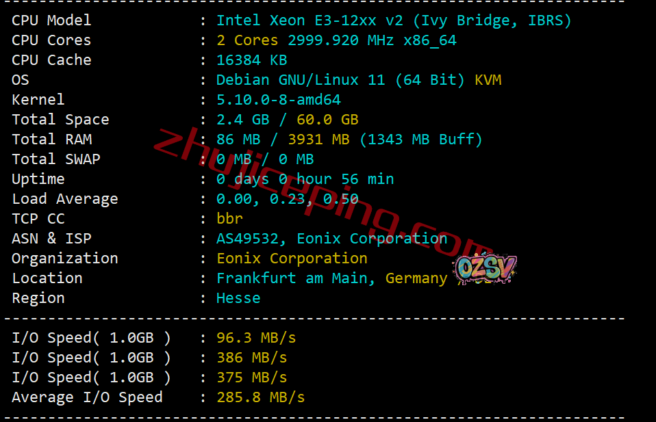 CPU型号为e3-1xx,这明显是虚拟化后的产物,实际并不是,不过这里的主频3.0GHz却是有参考价值的;站长启用了BBR,当前硬盘I/O大致在285MB/S的样子,IP归属德国;