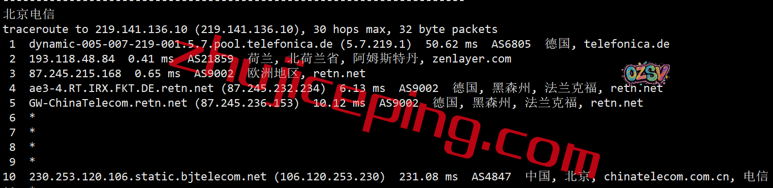电信去程,骨干网对接telia,绕道去了美国后再去欧洲