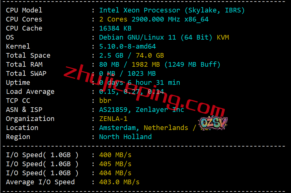 CPU主频2.9GHz,开启BBR,zenlayer自己的IP,当前硬盘I/O大致403MB/s: