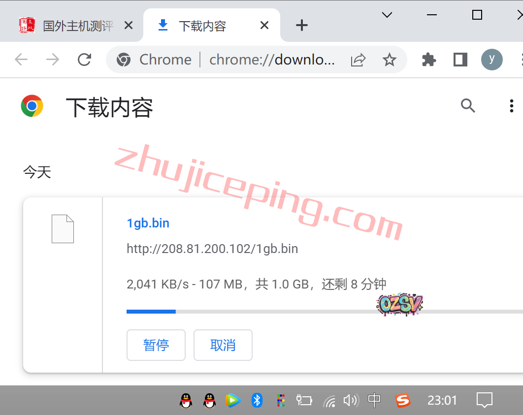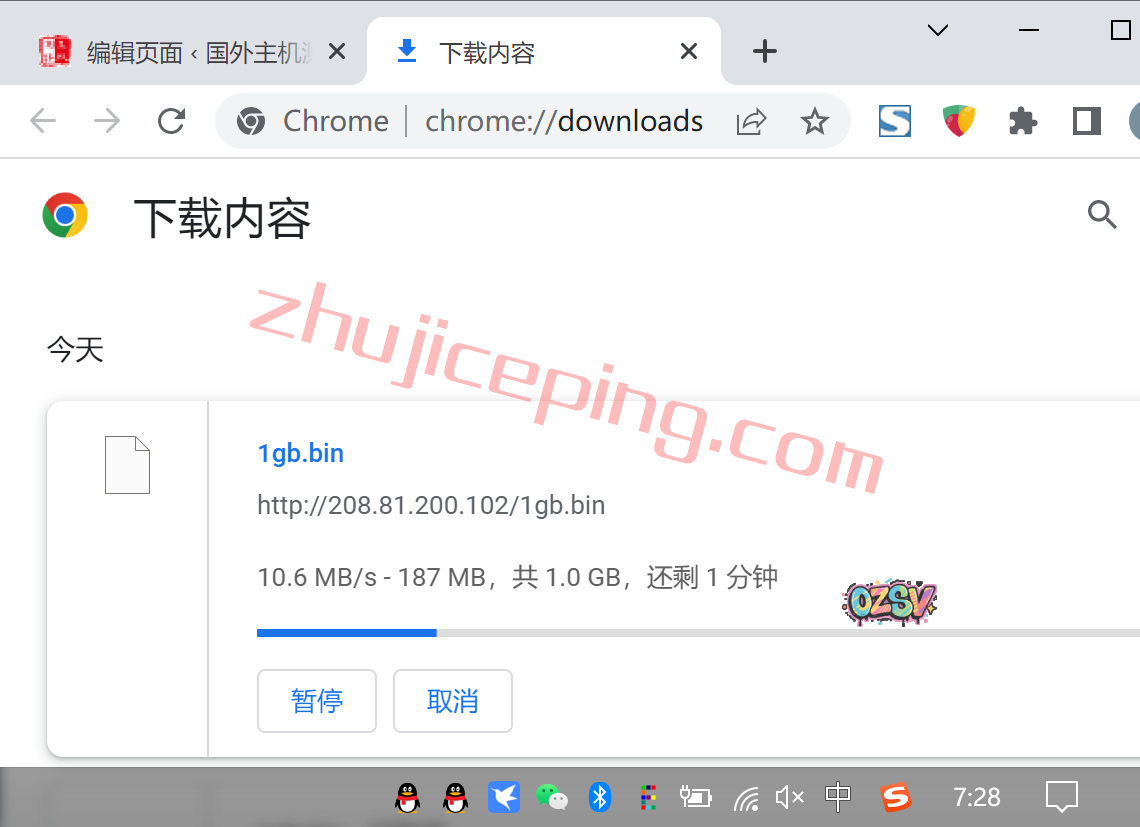 存放在测试小鸡上面的文件,广州电信直接用Chrome浏览器来跑下载,速度大致在10.6MB每秒: