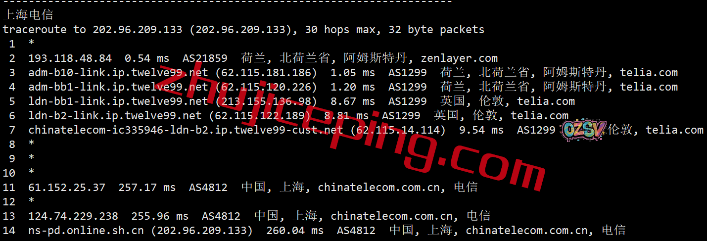 上海方向:走telia,从英国伦敦电信节点出来回国