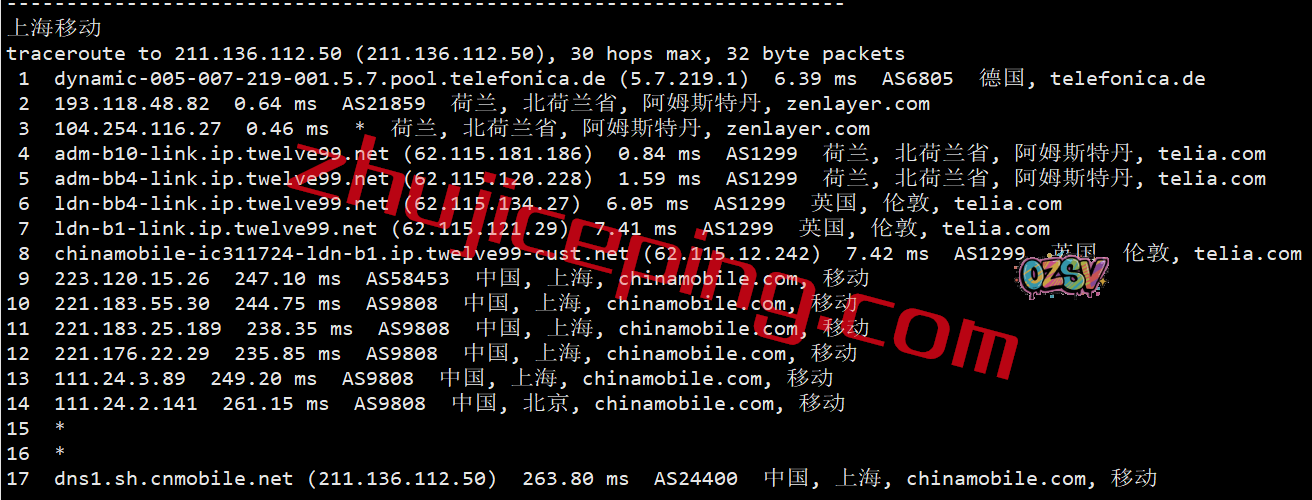 上海方向:走telia,从移动在英国伦敦的节点回来