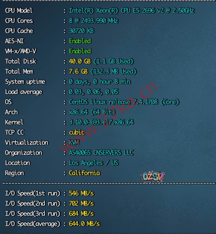 站长弄了一台美国CU2的云服务器,官方说的是200Mbps美国CU2线路带宽。拿到机器,CPU为E5-2696v2,测试硬盘I/O在644MB/s的样子: