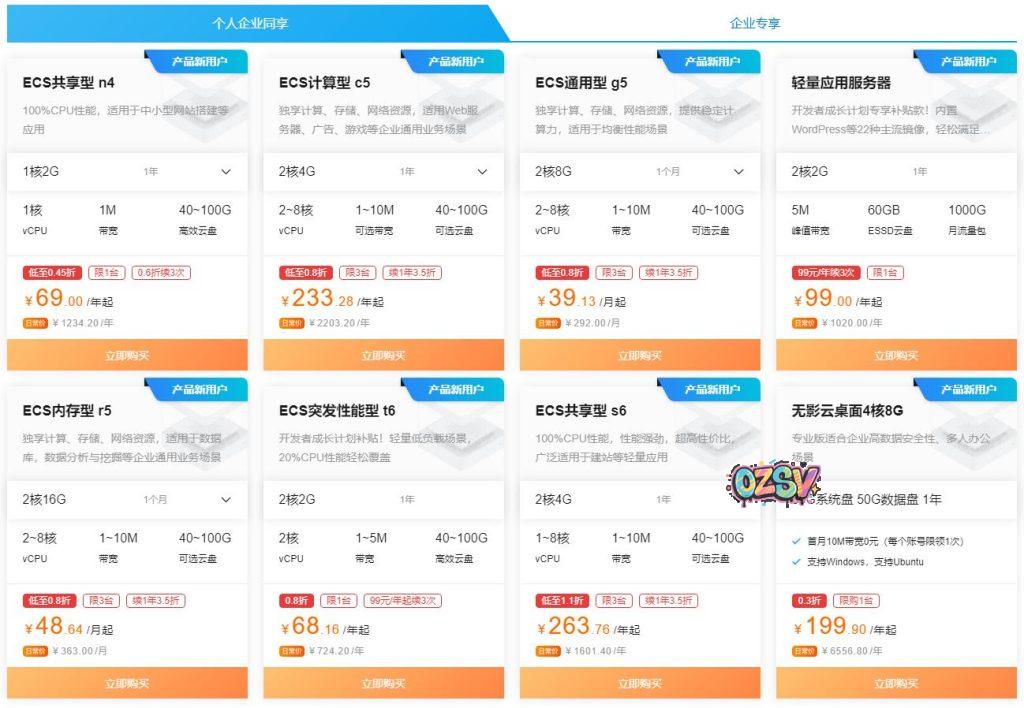 新用户完成实名认证或企业认证,即可享受低至0.6折购买,每人限1次,限购1~3台,我们可以看到轻量服务器低至年付99元,ECS云服务器n4低至年69元/年。