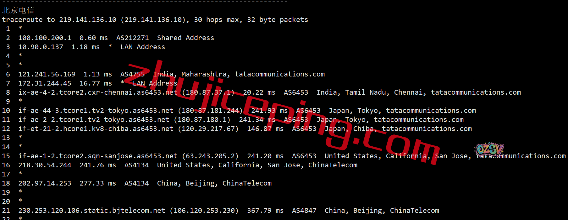 北京方向:印度出来一路走tata先到日本然后美国圣何塞,再从电信圣何塞节点直连回国