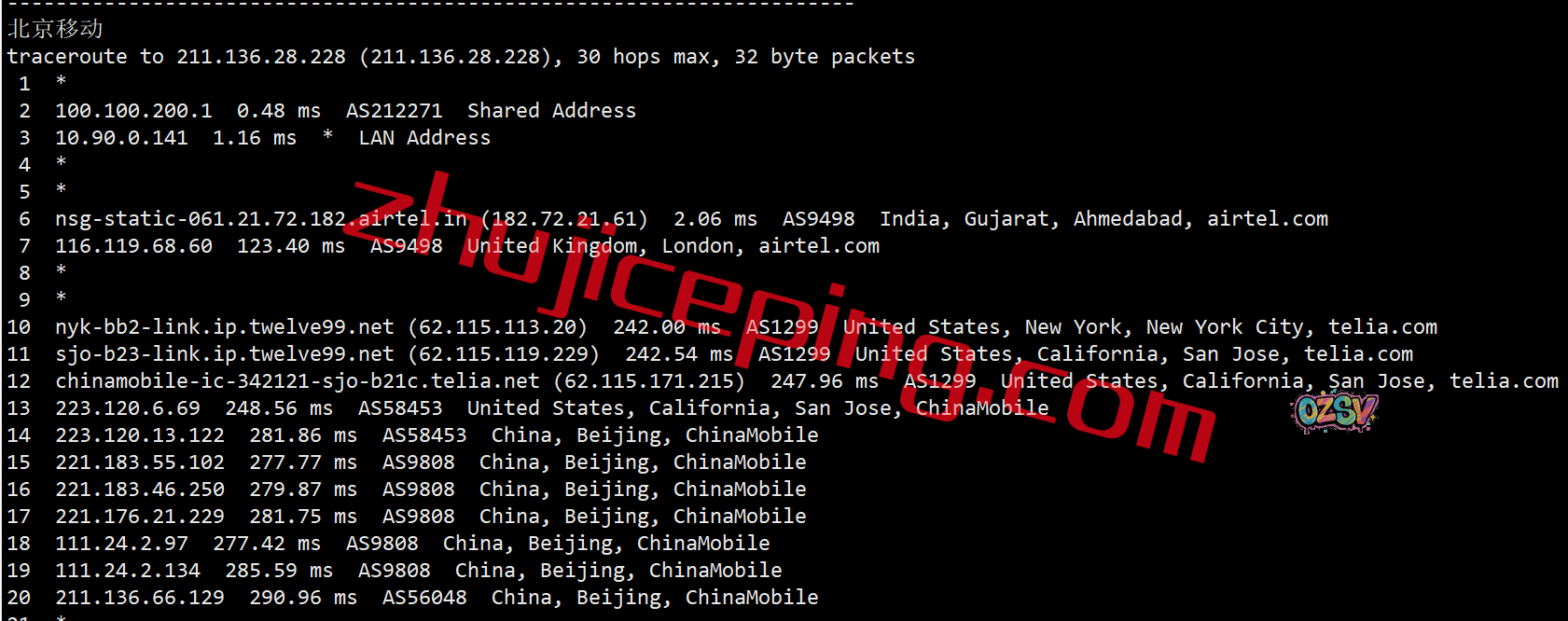 北京方向:印度出来走telia到英国、美国纽约、圣何塞、在移动圣何塞节点直连回来