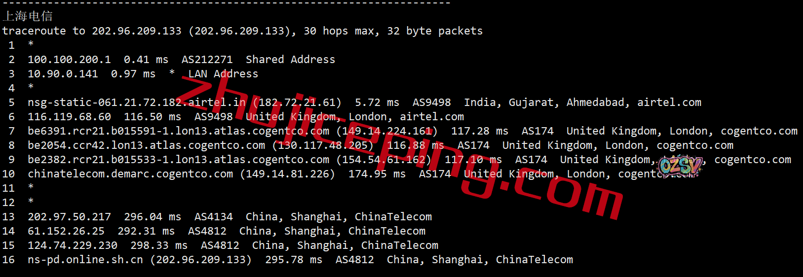 上海方向:从印度出来之后一路cogent直奔英国,然后用电信伦敦节点直连回国