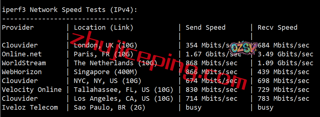 来看一看小鸡的网络能跑到什么程度吧,除第一就近节点之外其余的都是国内的三网节点,测试的是上行和下行带宽的情况: