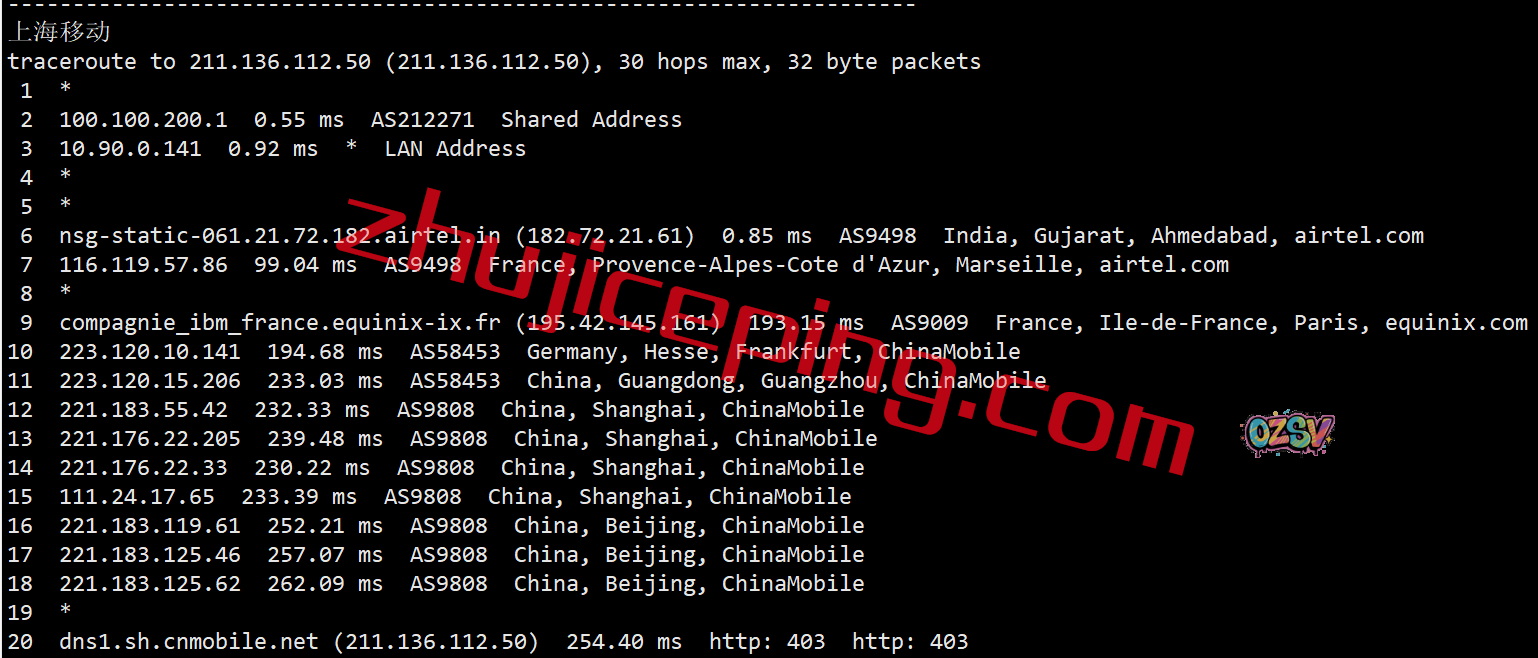 上海方向:印度、法国、德国,从移动德国法兰克福节点直连回来