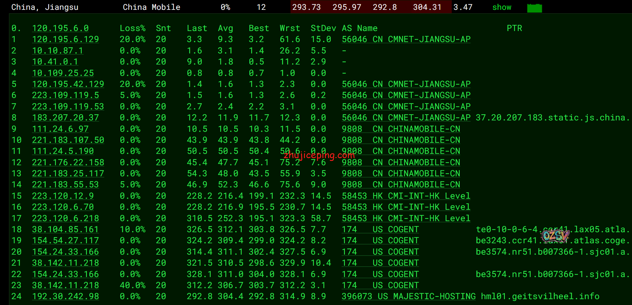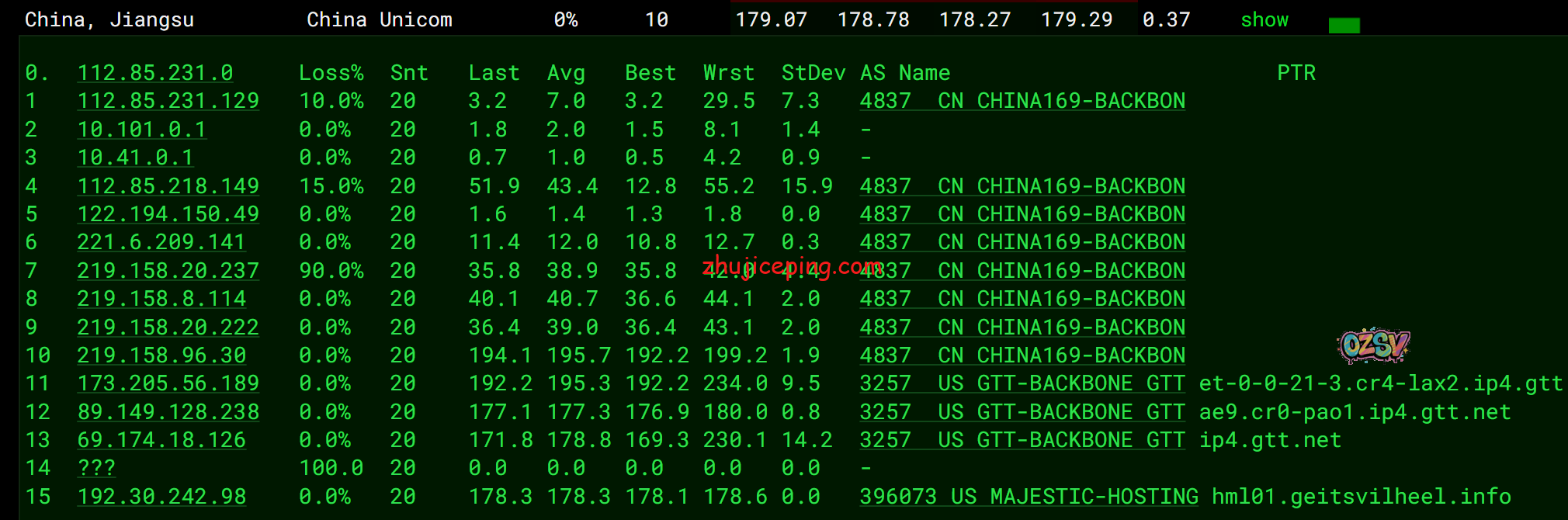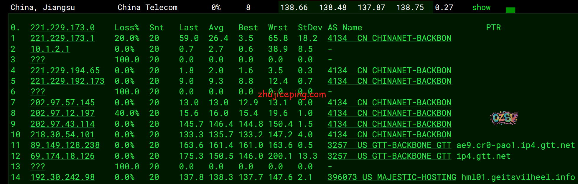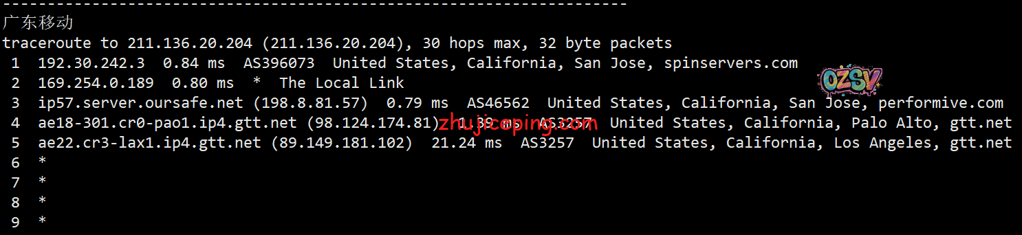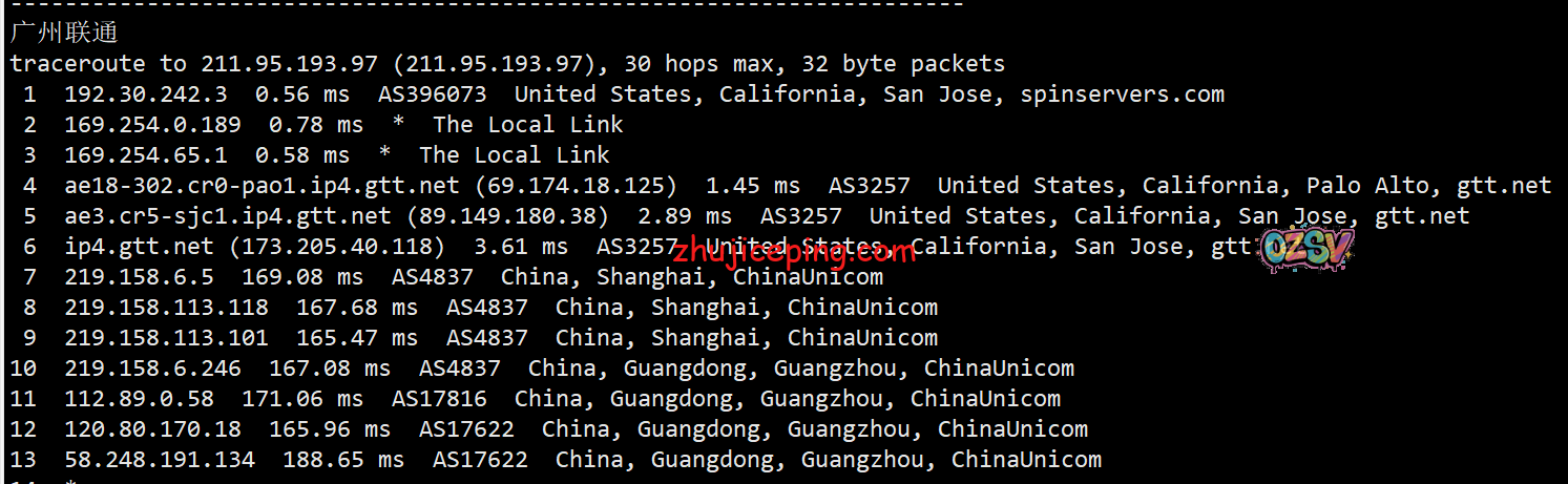 这个圣何塞VPS基本上是以走GTT线路为主,部分走其他的;整体来说网络条件属于一般,比cn2 gia等差不少,比走cogentco或者telia又好不少。